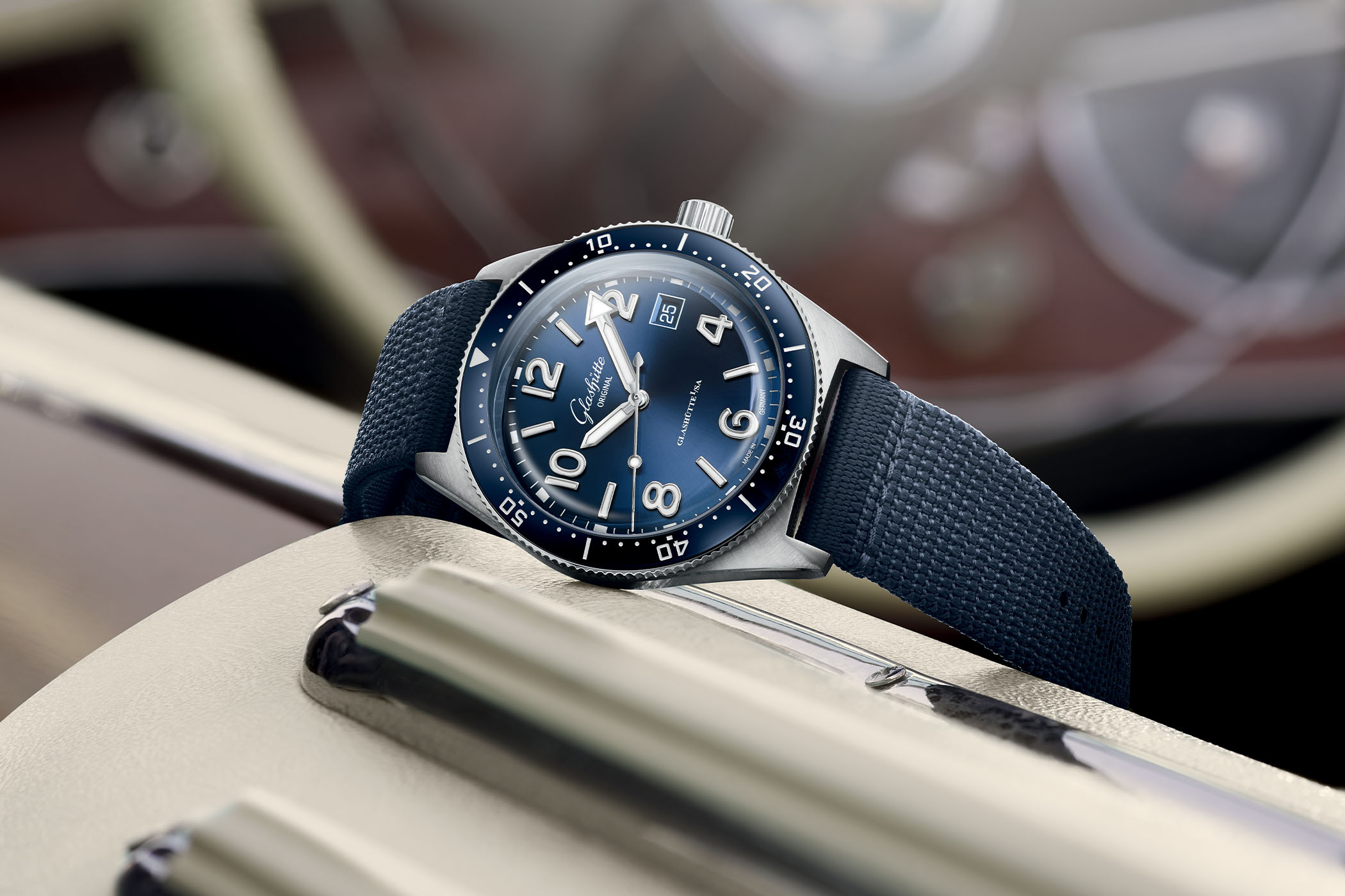 To finalize the casual look of this new Bicolor edition, Glashütte Original offers two strap options. First, as presented here, is a synthetic textile strap in blue. Second is a classic black rubber strap. Both can be ordered either with a pin buckle or a fold fastener.