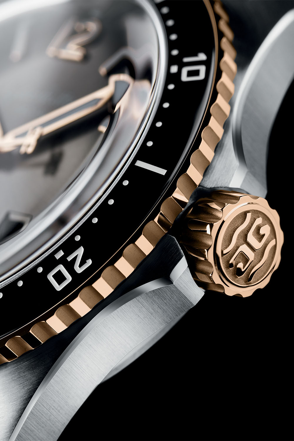 Launched in 2019, this new collection includes two different models. First is a vintage-inspired watch with compact dimensions and a retro-styled dial, the SeaQ 39.5mm. Second is a more modern approach to the concept, which mixes design elements of the 1969 Spezimatic with more robustness and a high-end movement. This is the SeaQ Panorama Date. Introduced first in steel with a blue or black dial, it is now offered with a more refined mix of materials and new dial colours, with the new Bicolor and Red Gold editions.