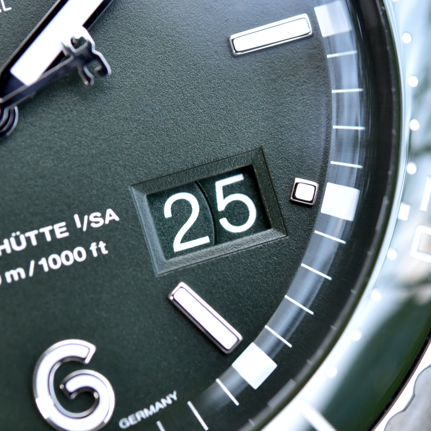 Inside ticks the in-house produced automatic Calibre 36-13, which can be seen through the sapphire caseback. This uses 41 jewels, runs at a frequency of 28,800vph and once fully wound provides a very solid 100 hours of power reserve through a single barrel. Winding is done with a skeletonized rotor with signature Double G branding and a 21k gold peripheral mass. It fits the case well and is finely decorated according to the Glashütte standards. It indicates central hours, minutes and seconds. The date is divided into two discs, colour-matched to the Reed Green dial.