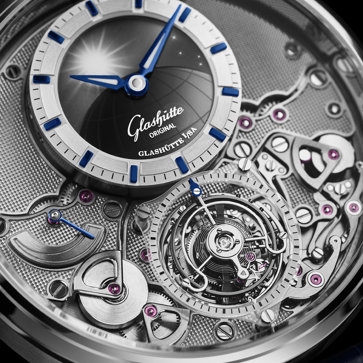 The bridges are no longer decorated with Glashütte stripes or elaborate hand engravings; instead, they are now engraved by laser with a raised Clous de Paris texture for a more contemporary look. Like the elevated dial, the flying tourbillon rises from the background on supporting columns, allowing a close-up view of the mesmerising spectacle. Not just the spectacle of a flying tourbillon, but stopping it and watching the blue-tipped seconds hand return to zero as the minute hand advances.