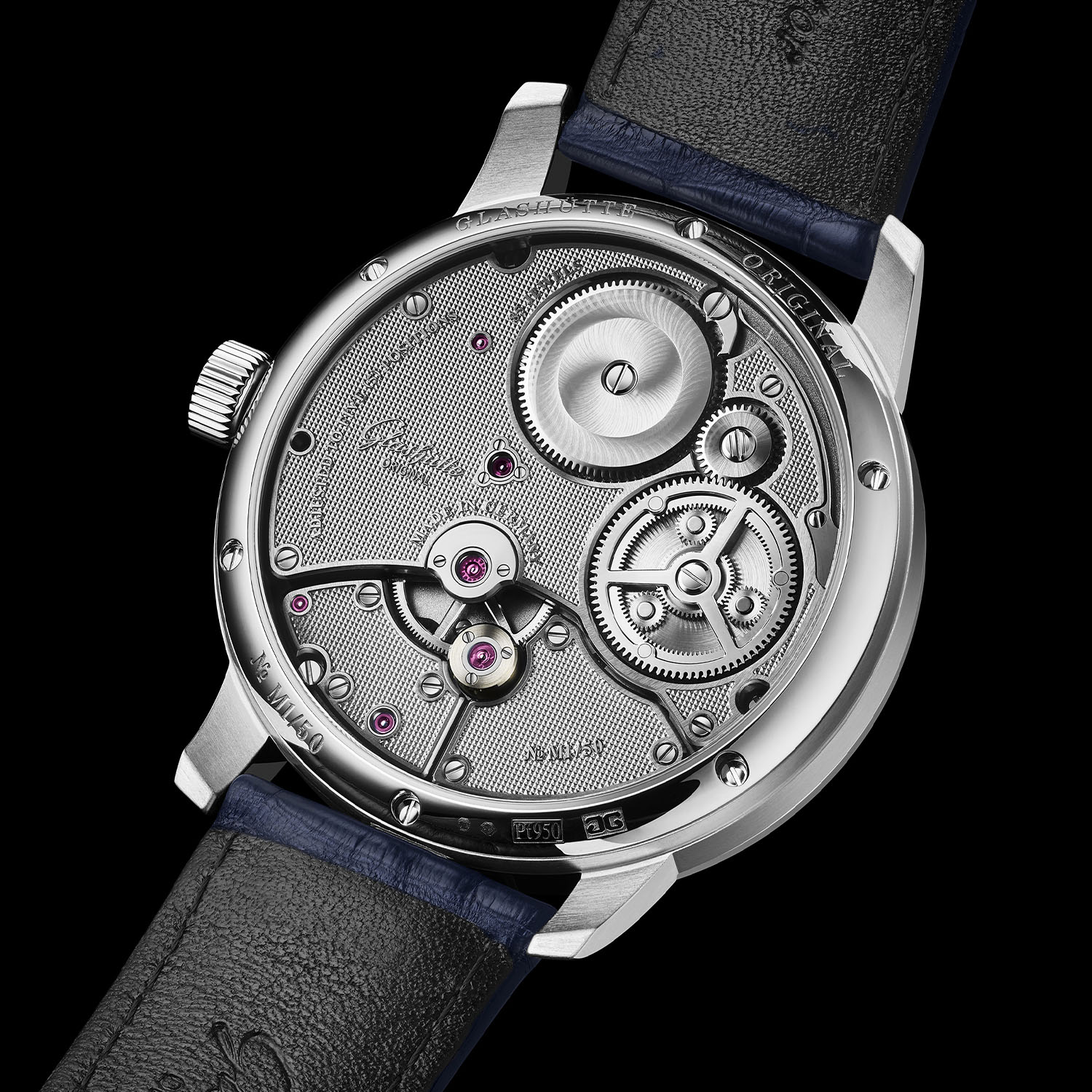 The reverse side reveals a series of laser-engraved bridges and some components of the manual-winding calibre 58-06. Running at a frequency of 21,600vph and providing a power reserve of 70 hours (indicator on dial at 9 o’clock), the movement has a silicon balance spring to protect it from magnetic fields and changes in temperature. Certified by the Thuringian Weights and Measures Office, the movement is chronometer certified.