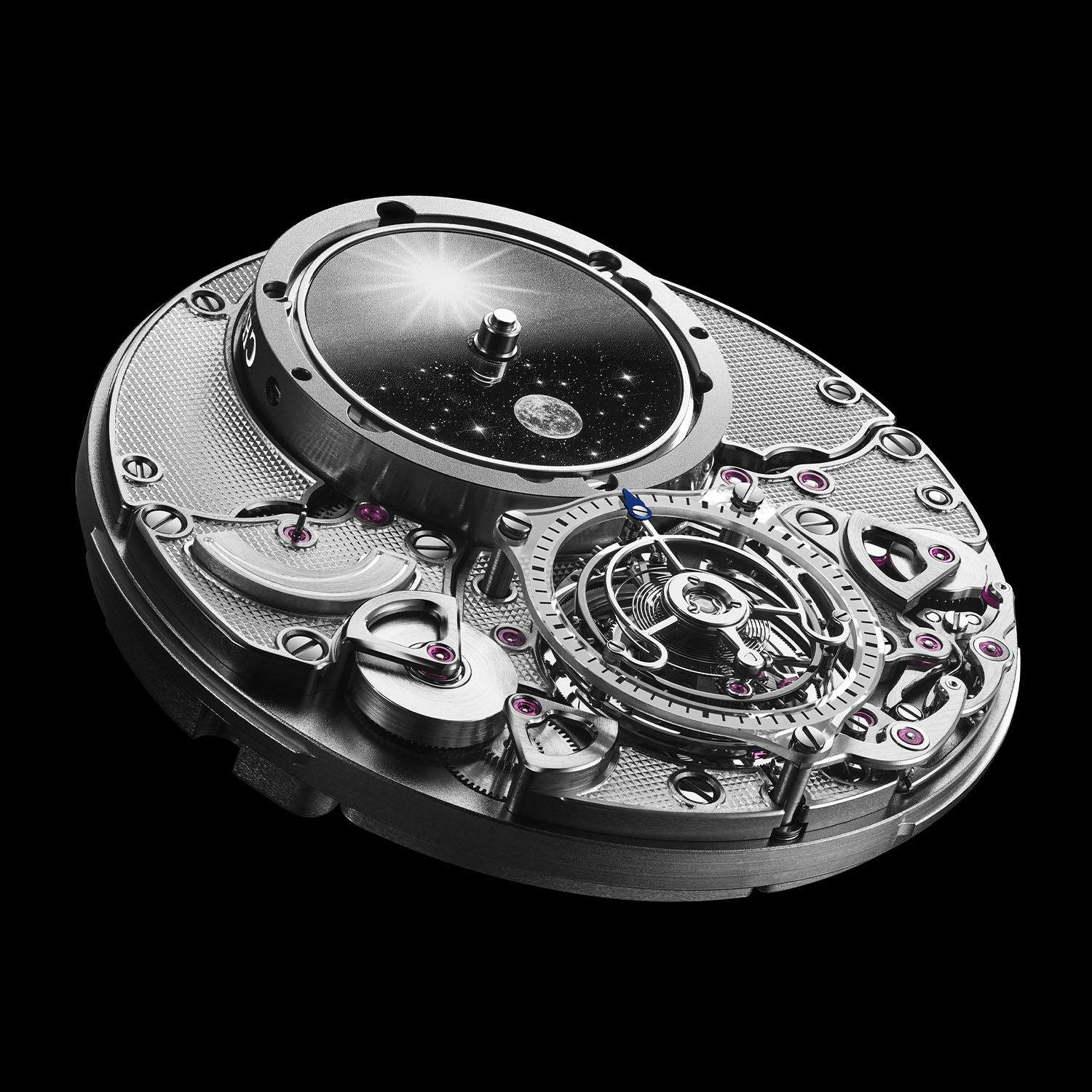 Composed of stepped levels, the off-centred hours and minutes dial at noon has an engraved globe in its centre, surmounted by the Sun and the Moon. The two heavenly bodies orbit on a spherical axis every 24 hours providing a day/night indicator. Blue hour markers are applied to the chapter ring and indicated by blued hands with a strip of luminescence.