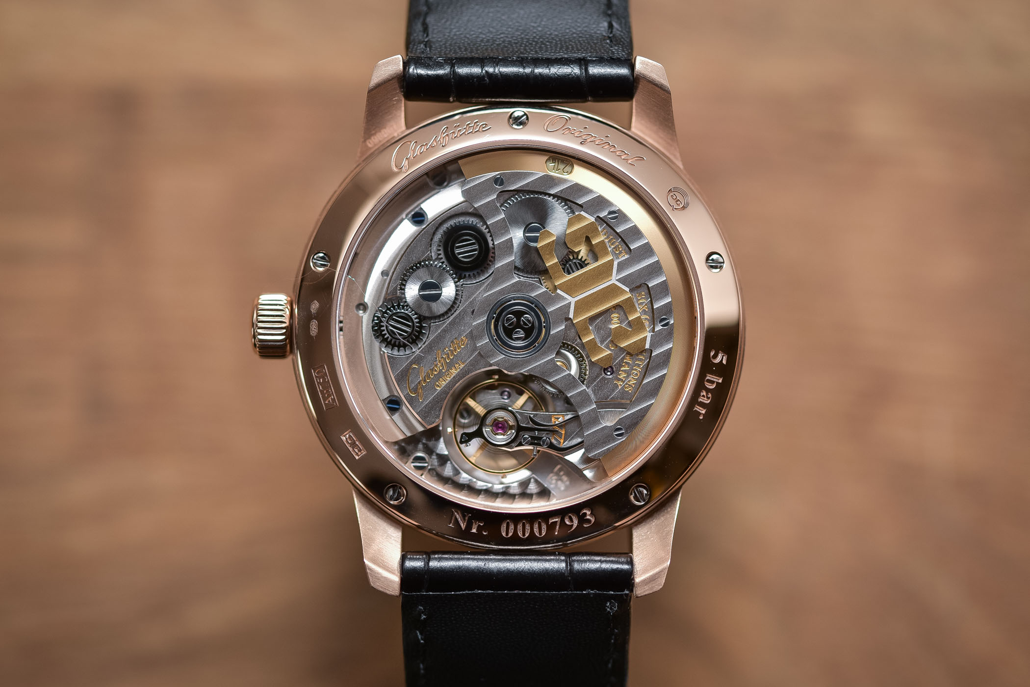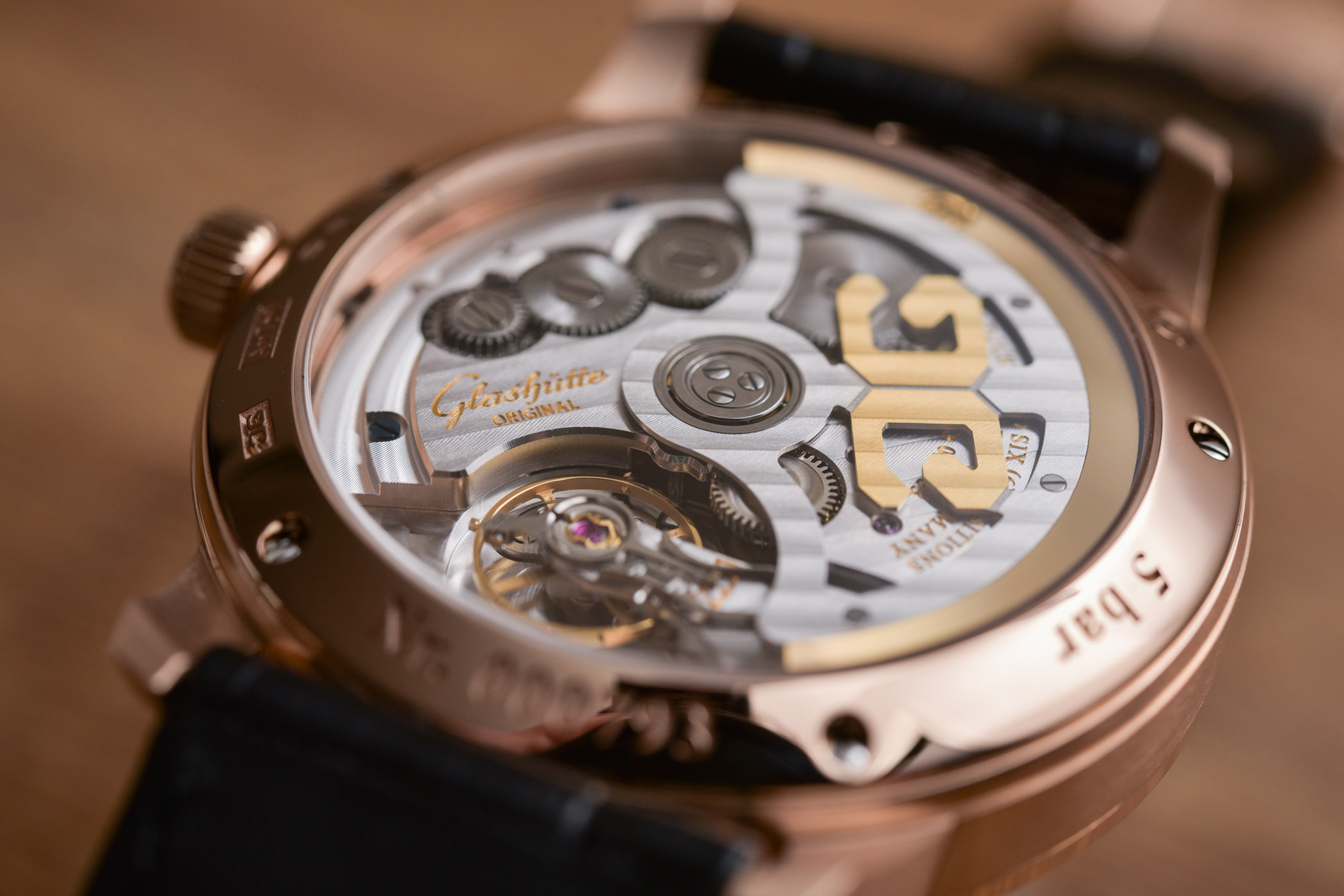 Equipped with a silicon balance spring for increased precision, the single spring barrel can provide more than 100 hours power reserve at a frequency of 4 Hz. It might be modern in terms of technology, but the movement displays the characteristic three-quarter plate with Glashütte stripes, the skeletonised rotor with its oscillating mass in 21k gold, perlage on the base plate, screw-mounted gold chatons, blued screw and bevelled edges. GO went one step further and submitted the calibre to in-house chronometric tests for a period of 24 days, many of them surpassing German Chronometry tests.