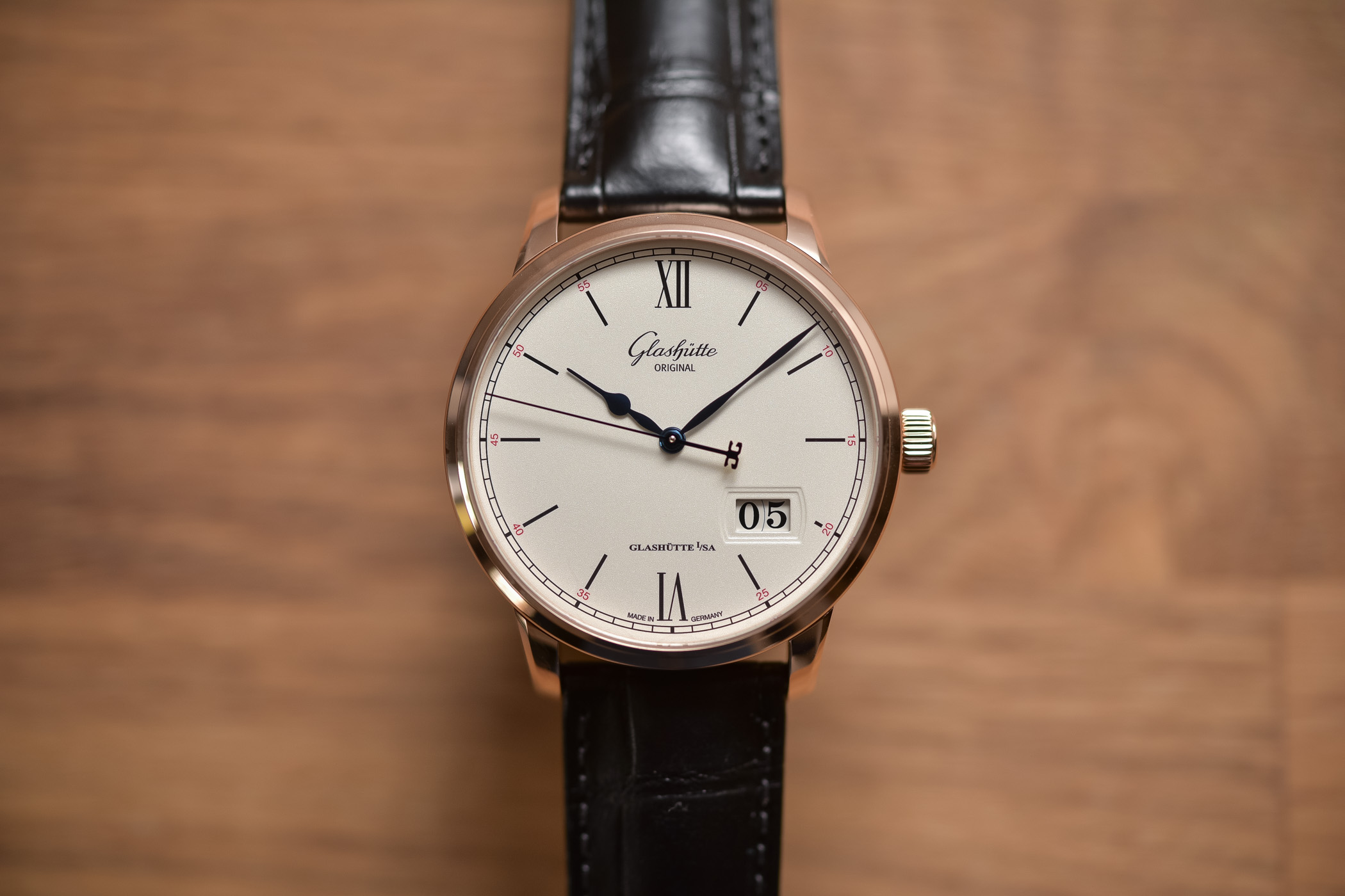 The more I look at the minimalist elegance of the black batons and red minute numerals, the more they remind me of the Bauhaus aesthetic practised by another well-known German brand just down the road. This discreet but very effective use of colour really gives the watch a modern feel that works well with the more traditional pear-shaped blued hands (beautifully executed, by the way), the cursive Glashütte logo and the generous date window. Warmer than an enamel or lacquered dial the grainy texture of the dial would be impossible to replicate in more conventional industrial dial processes.