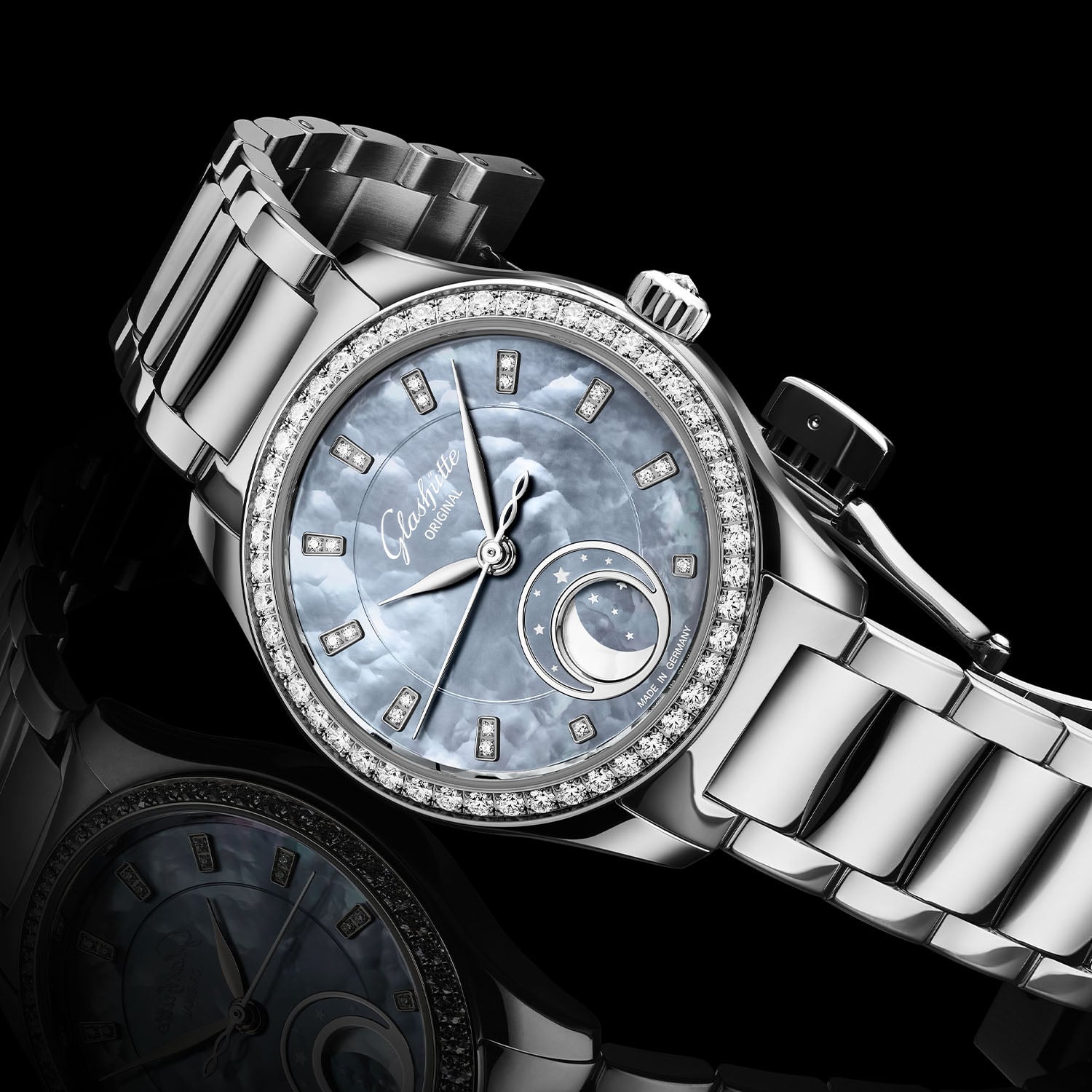 Glashütte Original released its Serenade Luna in 2024, featuring moon phase indications. Unlike the Panomatic Luna, which is essentially a scaled-down adaptation of the men’s PanomaticLunar with its off-centred dial and Panorama date window, the Serenade Luna was conceived from the start as a women’s watch with a petite 32.5mm diameter, a sprinkling of diamonds and a traditional layout with the moon phase aperture at 6 o’clock. Joining the collection is the new Serenade Luna Skyline Blue.