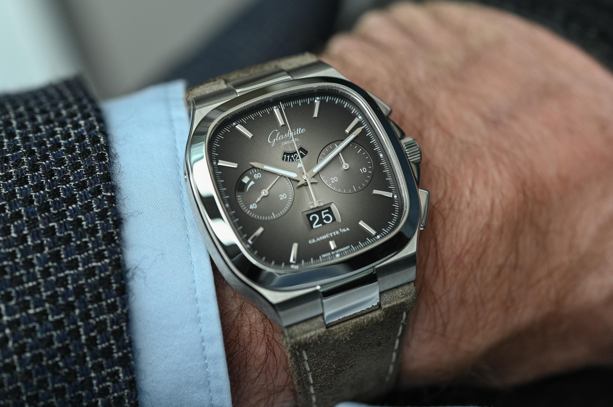 The watch comes with a nubuck leather strap, although it is also available with a steel bracelet and a price of EUR 13,700. Prices may vary from country to country but the watches are already arriving to boutiques, so speed is of the essence. More details at glashuette-original.