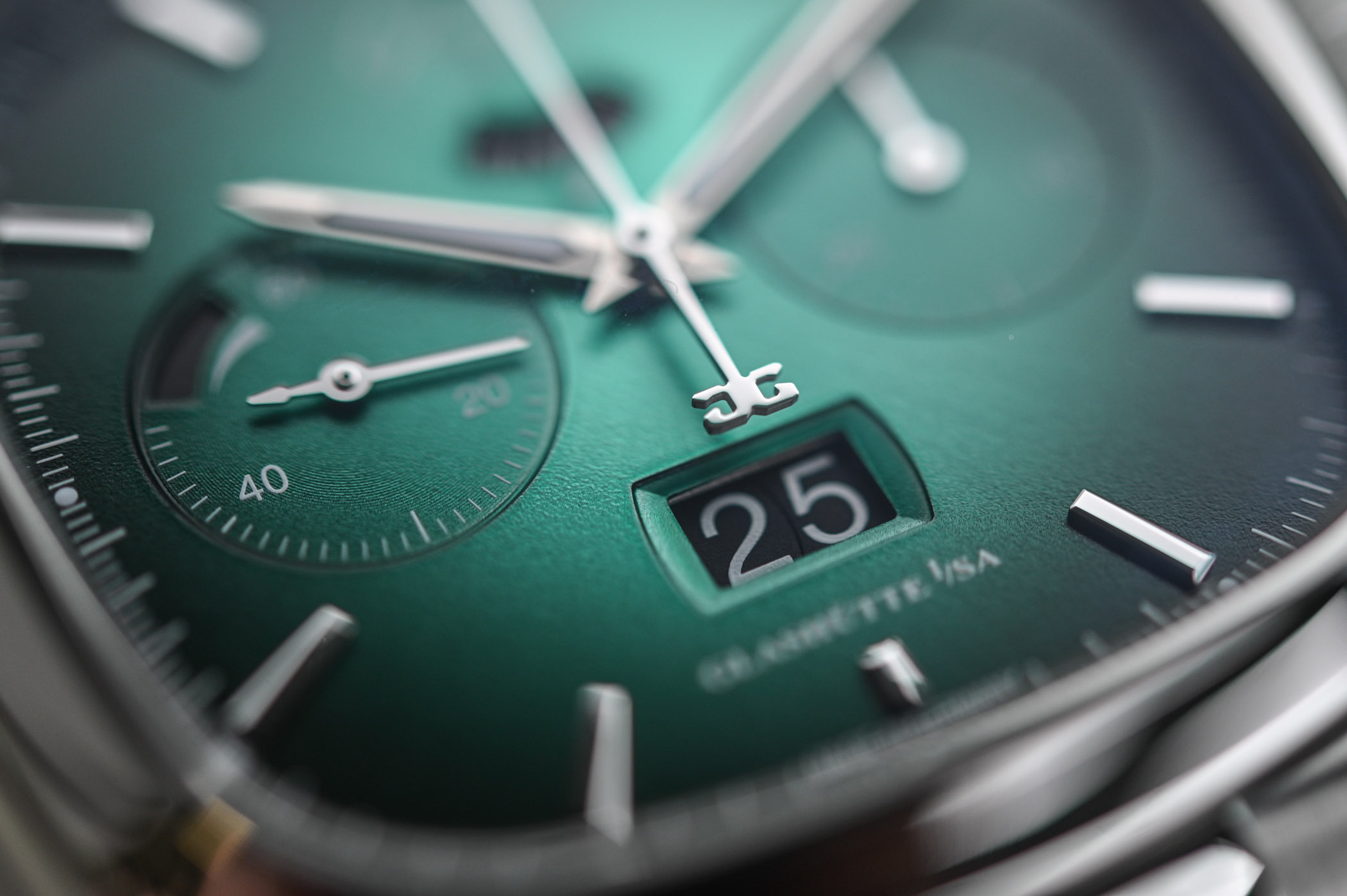 The result is absolutely stunning: the sphere has a spellbinding sensation of depth and it is practically impossible to choose one over the other. Depending on the light, the serene grey dial can even look beige while the green is more vibrant, more in tune with a 1970s-inspired chronograph.