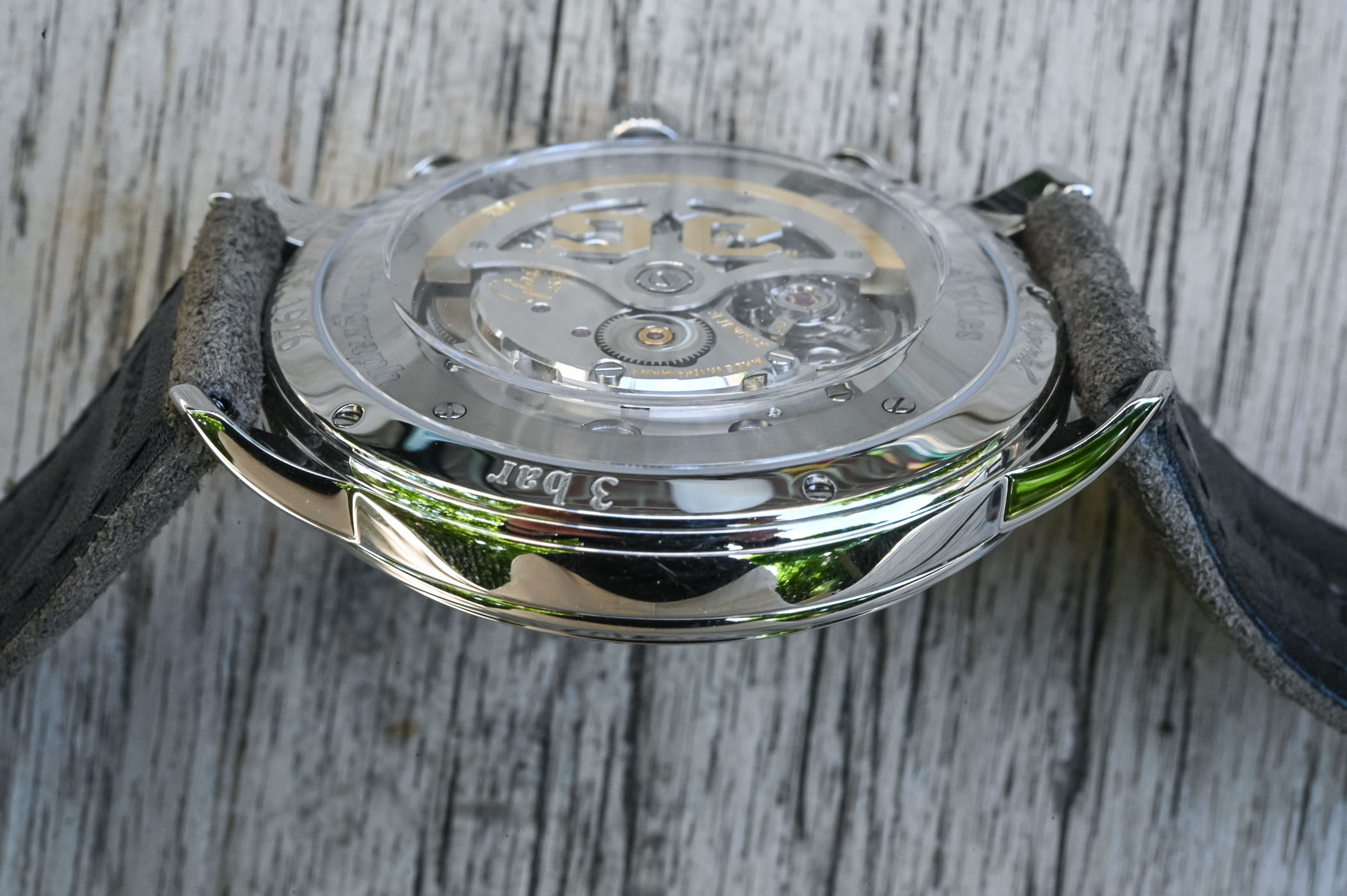 Another very desirable feature of this watch (and the time-only model too) is the curved caseback, which allows an uncluttered view on the movement – even the sides of the movement – but also greatly participate to the comfort of the watch. This prominent sapphire box virtually slenderizes the profile of the case and make the watch very soft to the skin.