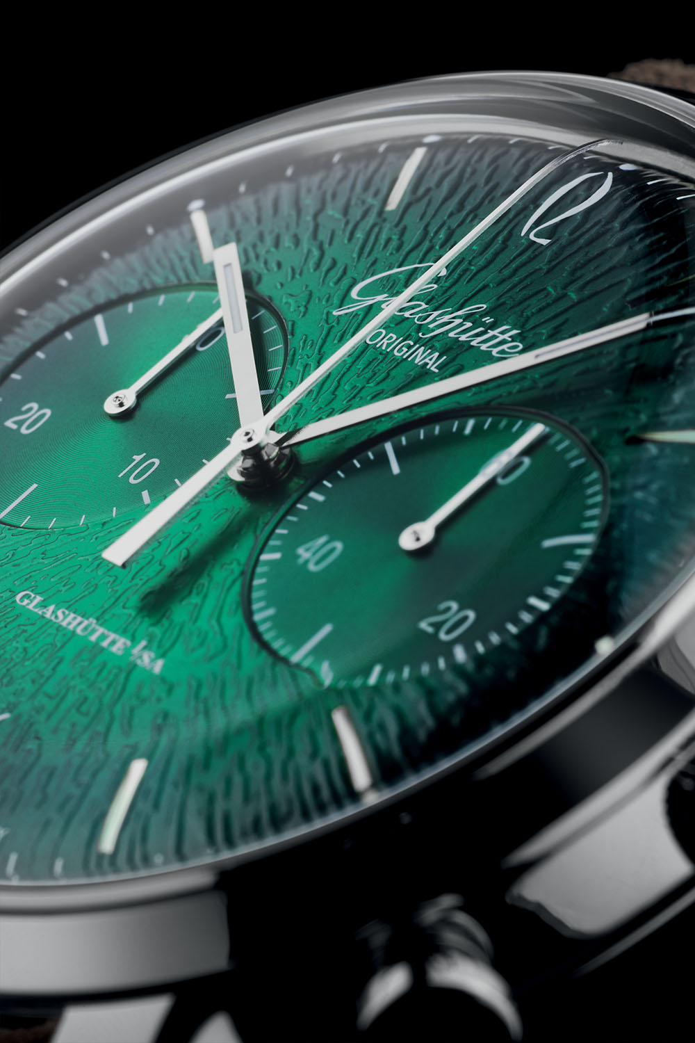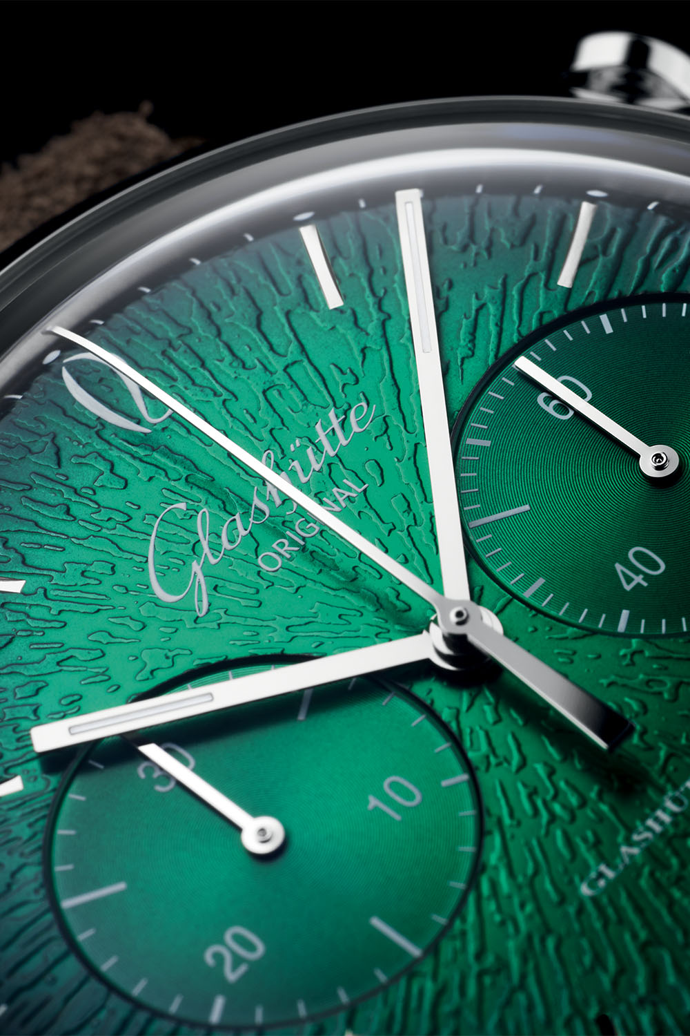 As one of the few manufactures with its own dial manufacture, Glashütte Original can experiment freely. The textured green dial starts life as a silver blank. To create the irregular rippled surface on the dial, the blank is embossed with a pattern using a 60-tonne press followed by a second press to create the characteristic domed shape of the dial. After it has been galvanised, coats of green lacquer are applied to the dial. To achieve the gradient effect, Pforzheim’s dial makers hand-spray black paint on the perimeter before it’s popped in the kiln.