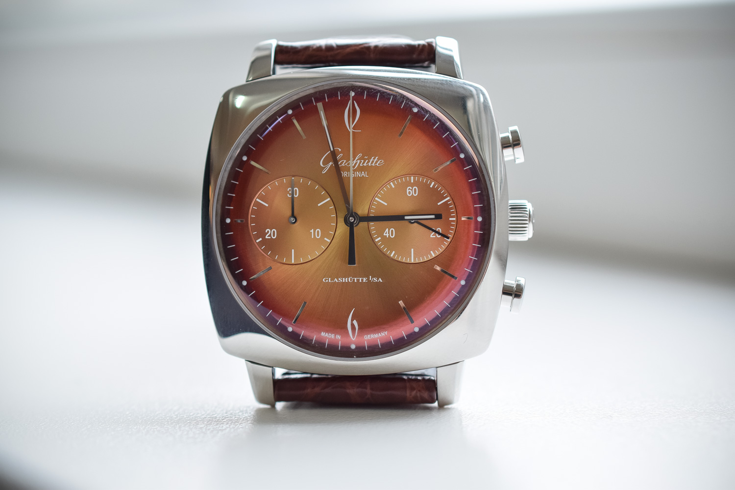 All five models in the Sixties Iconic Square Collection are presented in Glashütte Original’s distinctive square cushion shaped stainless steel case, measuring 41.35 x 41.35 mm and are powered by the in-house automatic Calibre 39-34 chronograph. All are fitted with a matching Louisiana Alligator leather strap: brown for the models featuring forest green or tangerine coloured dials, black to complement the models with graphite grey, ocean blue or fiery red dials. They wear extremely nicely on the wrist but they are certainly do not make for discreet dinner companions. Expect to get a lot of attention when you wear one of these beauties out and about.