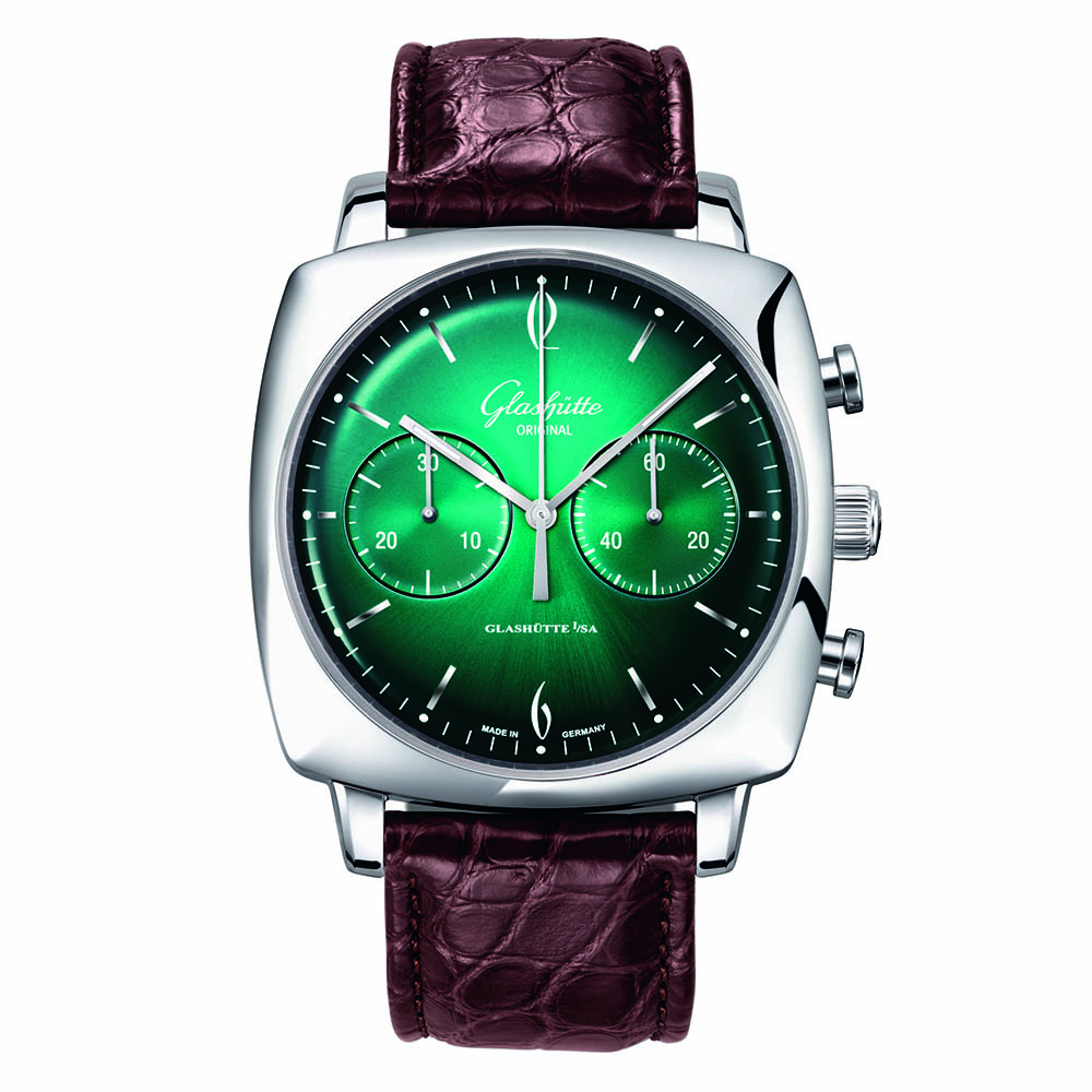 Looking back a bit at the past, you’ll discover that the production of Glashütte Original watches (at that time named GUB, for Glashütte Uhrenbetrieb) was far away from the current style of the brand, with their serious and understated looks – see for instance this modern one. Indeed, back in the 1960s, the most well-known watches were the Spezimatic. And they were rather bold in terms of design (cases could be very round to squared) and they were featuring highly colored dials, from orange to bright green. In order to pay a tribute to these times of funky creativity, the brand introduced in 2015 a first collection, based on the round Sixties collection, with 5 colored and textured dials (including turquoise, bright red or gold). With this same idea in mind, they now apply the concept to another bold collection, the Sixties Square Chronograph, still with bright and funky colors.