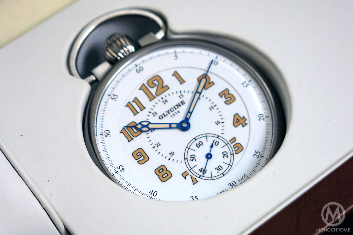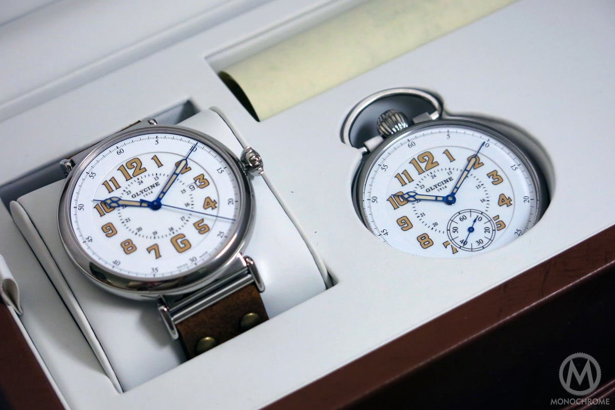 Limited to 250 pieces, this F104, so-named in honour of the Lockheed F104 aircraft, is a 48 mm watch with a beautifully balanced dial. It has a flat sapphire crystal, pilot style leather strap with rivets, and the original onion crown from the first models. The F104 watch is immediately recognizable, much like the 24-hour Airman, and identifies itself as Glycine. Add to this watch a pocket watch of identical size with its own chain included, and you have a nostalgic pairing, which epitomizes Glycine’s aviation connection. For true Glycine fans, this purchase is a must.