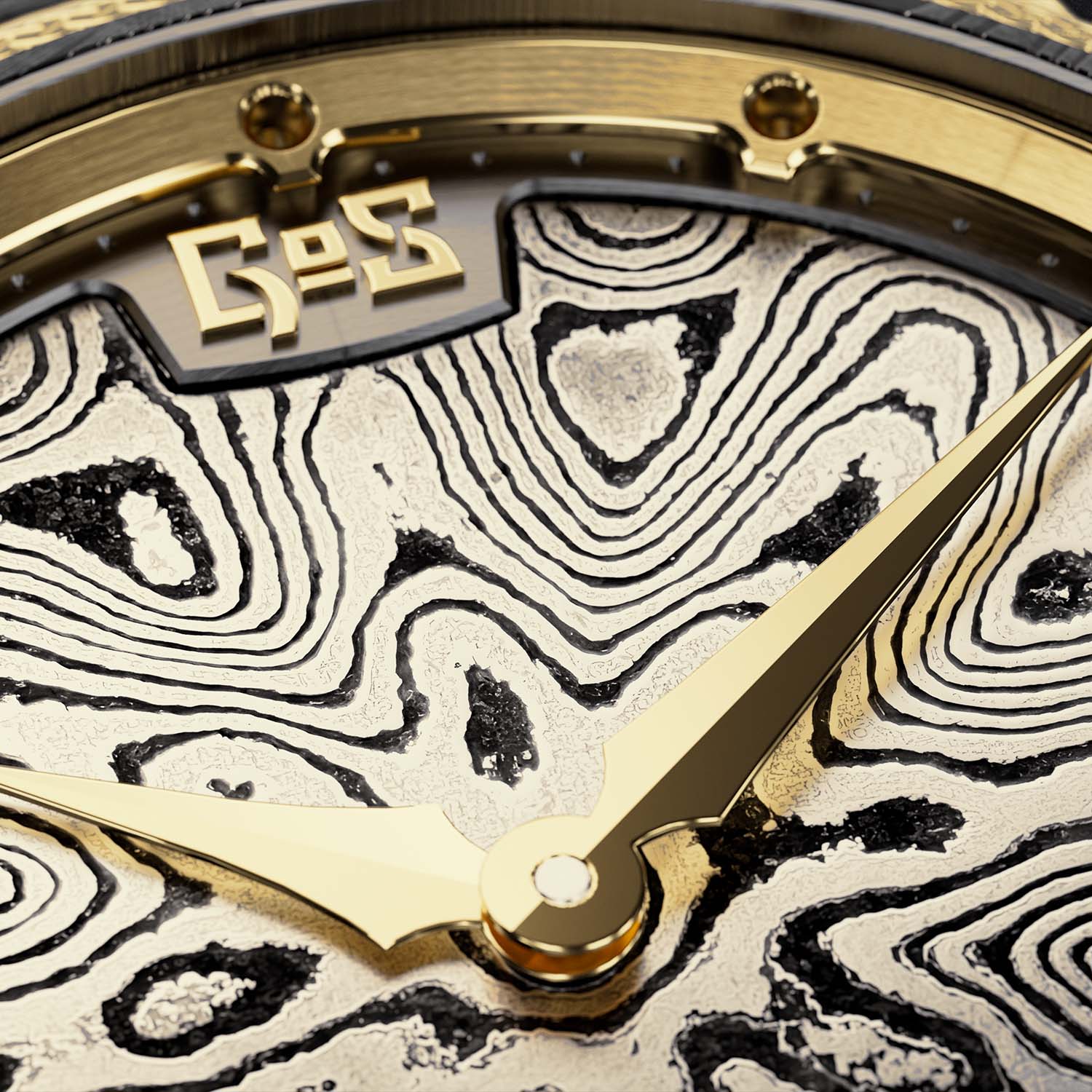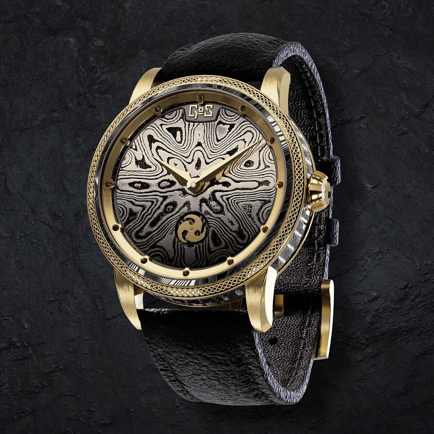 The dial is forged by bladesmith Conny Persson, the man involved in the latest GoS creations. The Damascus steel base features an evolved “wildflower” pattern, with organic lines and layered depth. In the GoS atelier, Sjögren machines, etches and hand-finishes each dial through an iterative process of polishing and oxidation, revealing contrast within the material. No two dials are identical. Surrounding it, a two-part chapter ring combines an anthracite base with polished markers and an upper ring in 4N gold. Central hours and minutes hands, styled as Viking arrowheads, are paired with a small seconds at 6 o’clock, shaped as the GoS triskele, a recurring symbol in the brand’s designs.