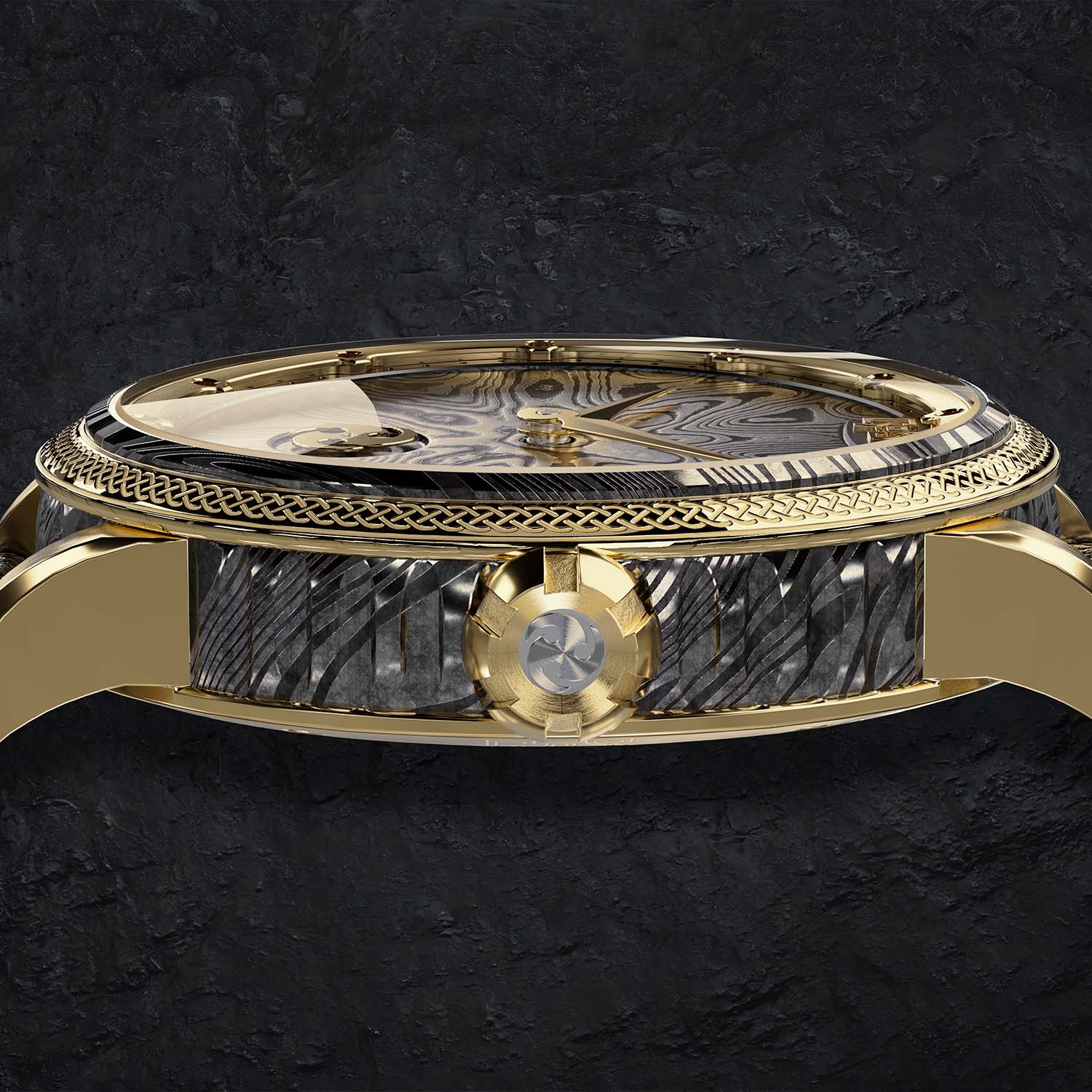 The 41.5mm case, to put it mildly, is uber-cool. The central case ring is made from stainless Damascus steel, treated with a bonded patina developed in-house. This darkened surface is structurally integrated into the steel, ensuring long-term durability and resistance to wear, with a deep, almost organic texture, reminiscent of weathered Viking artefacts. Framing this are hand-finished elements in 18k Swedish gold, bezel, caseback and lugs, creating a strong contrast between shadow and light. The case looks sharp and complex, but remains wearable, tapering from 12.1mm at its thickest point to 8mm at the edges. Water resistance is 50m, with sapphire crystals front and back.