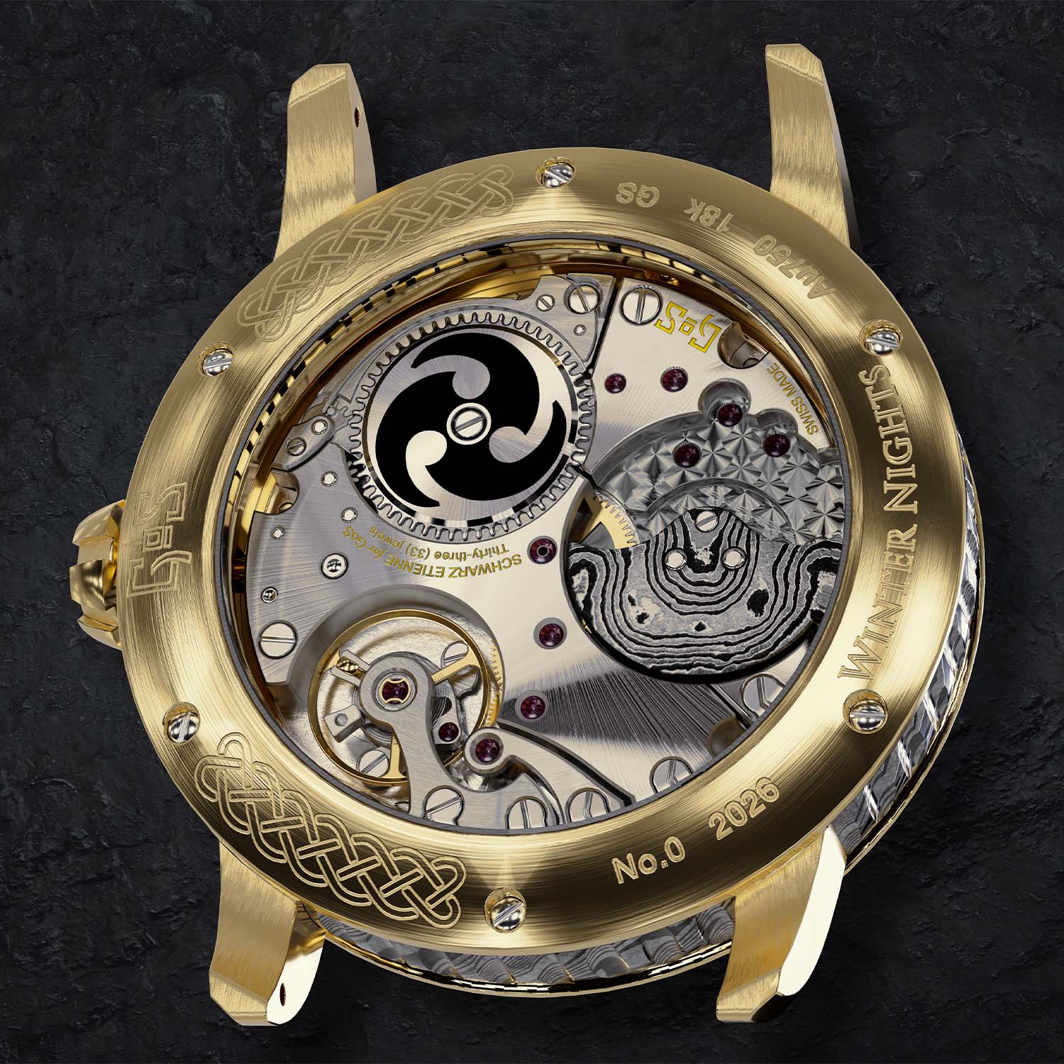 The Winter Nights III is powered by a movement developed with Schwarz Etienne and finished to GoS specifications. The automatic calibre features a micro-rotor with a Damascus steel counterweight. Beating at 21,600 vibrations/hour, it delivers an 86-hour power reserve. The construction is clean and traditional, with hand-polished bevels, a separate escape wheel bridge and subtle engravings, including the triskele motif.