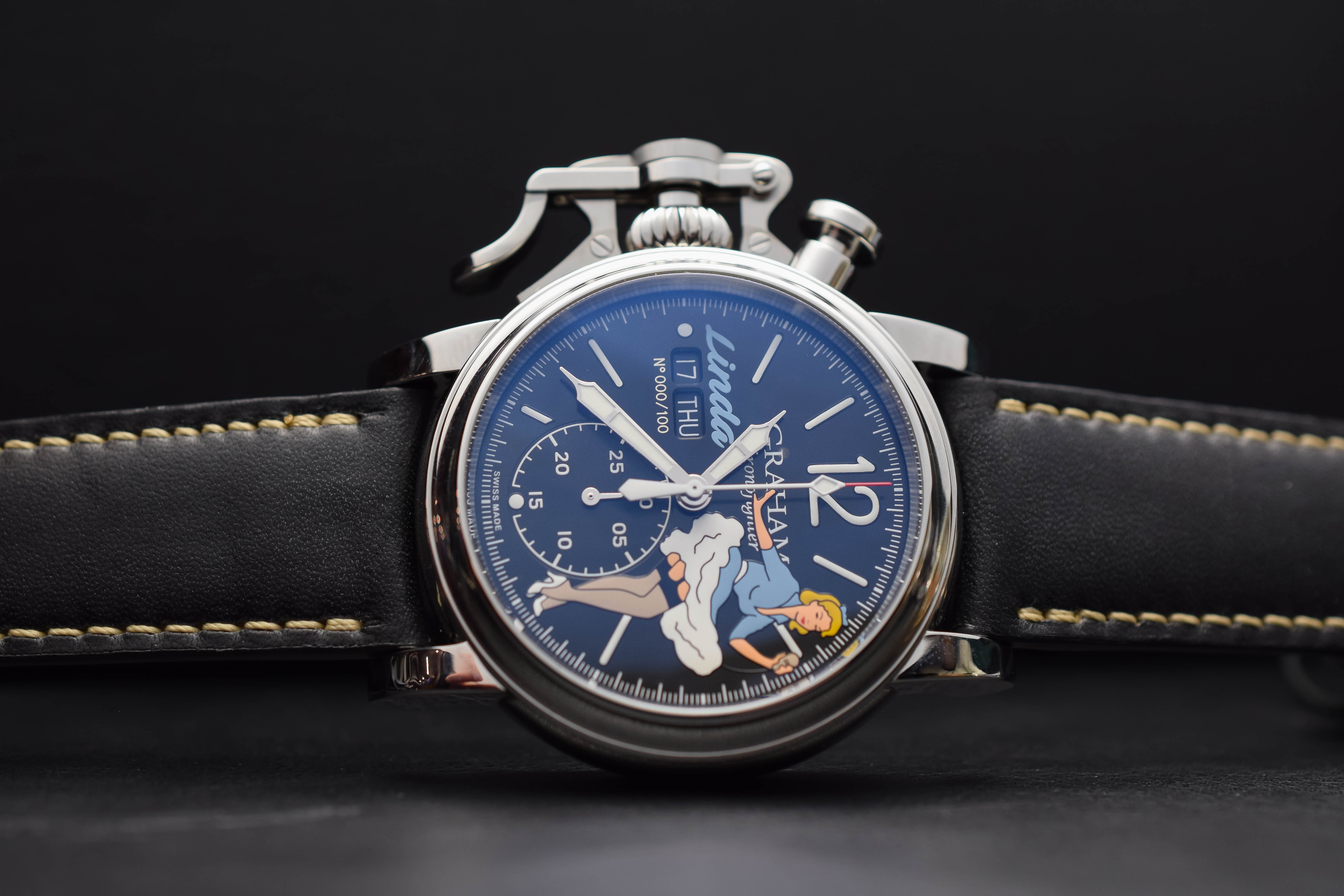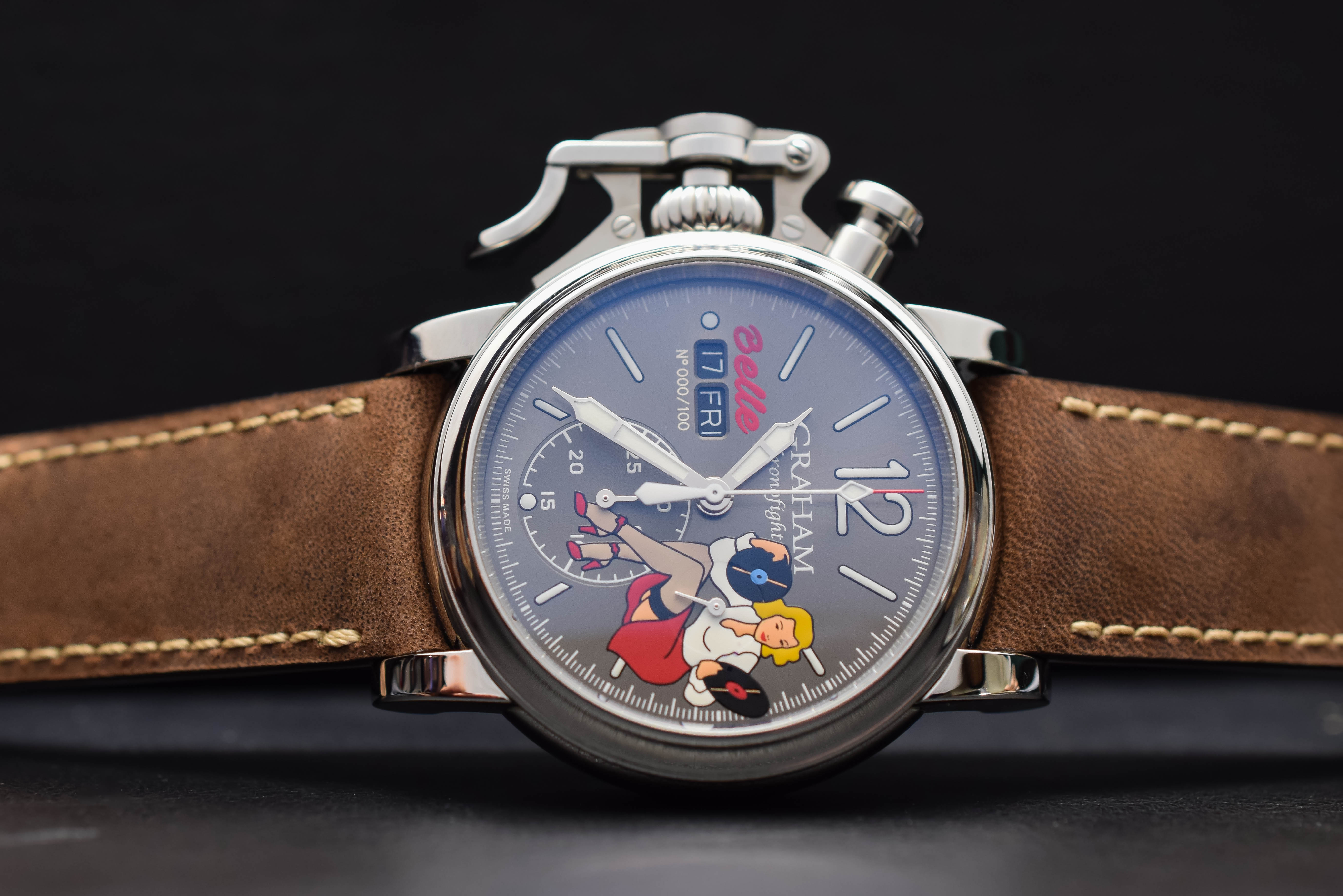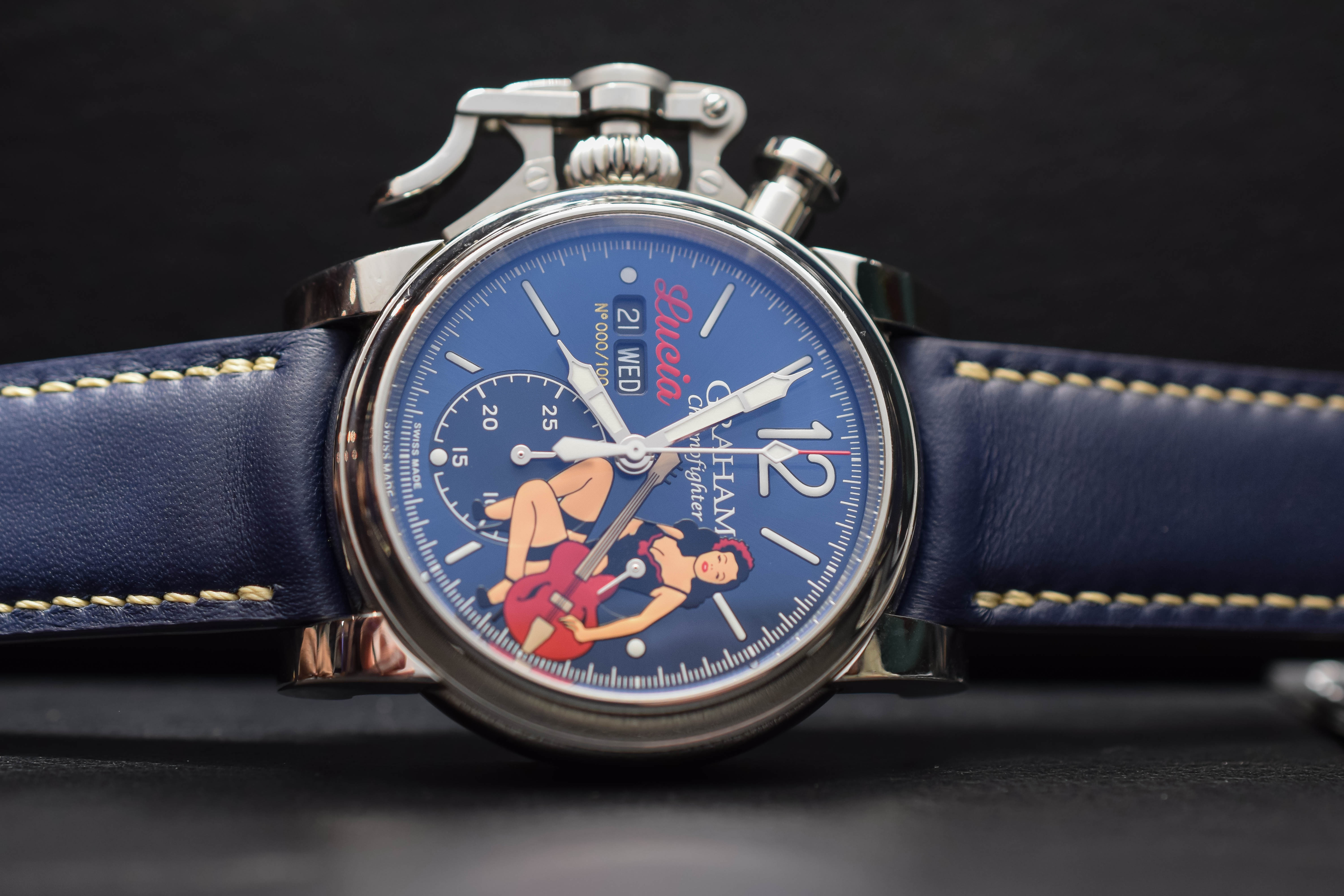 The Graham Chronofighter Nose Art watches are worn on a hand-sewn calfskin leather strap with a steel pin buckle. All watches are limited editions of 100 pieces, with their individual number indicated on the sun-brushed dial at 9 o’clock, just under the date. Price is set at CHF 5,450. For more information, visit www.graham1695.com.