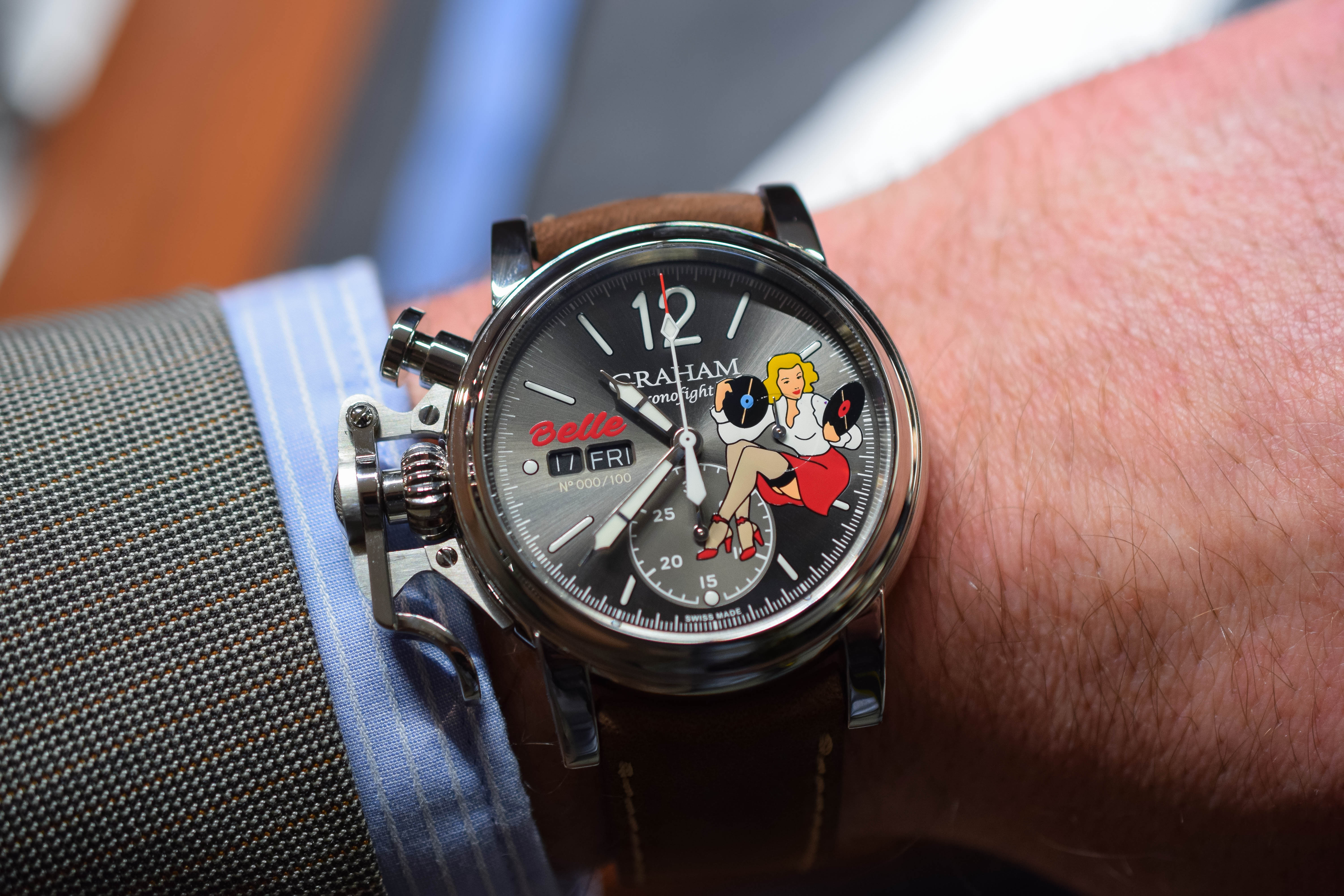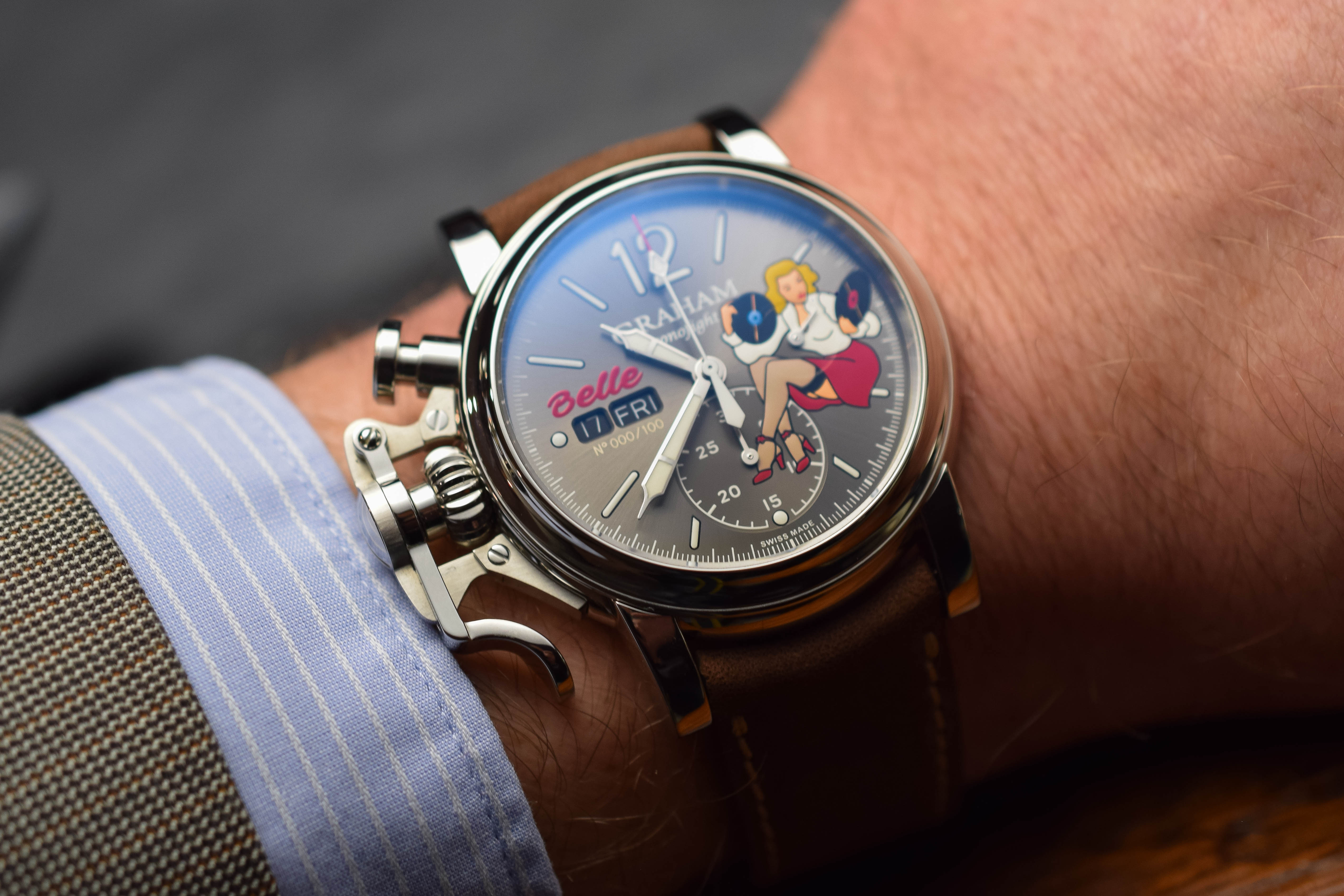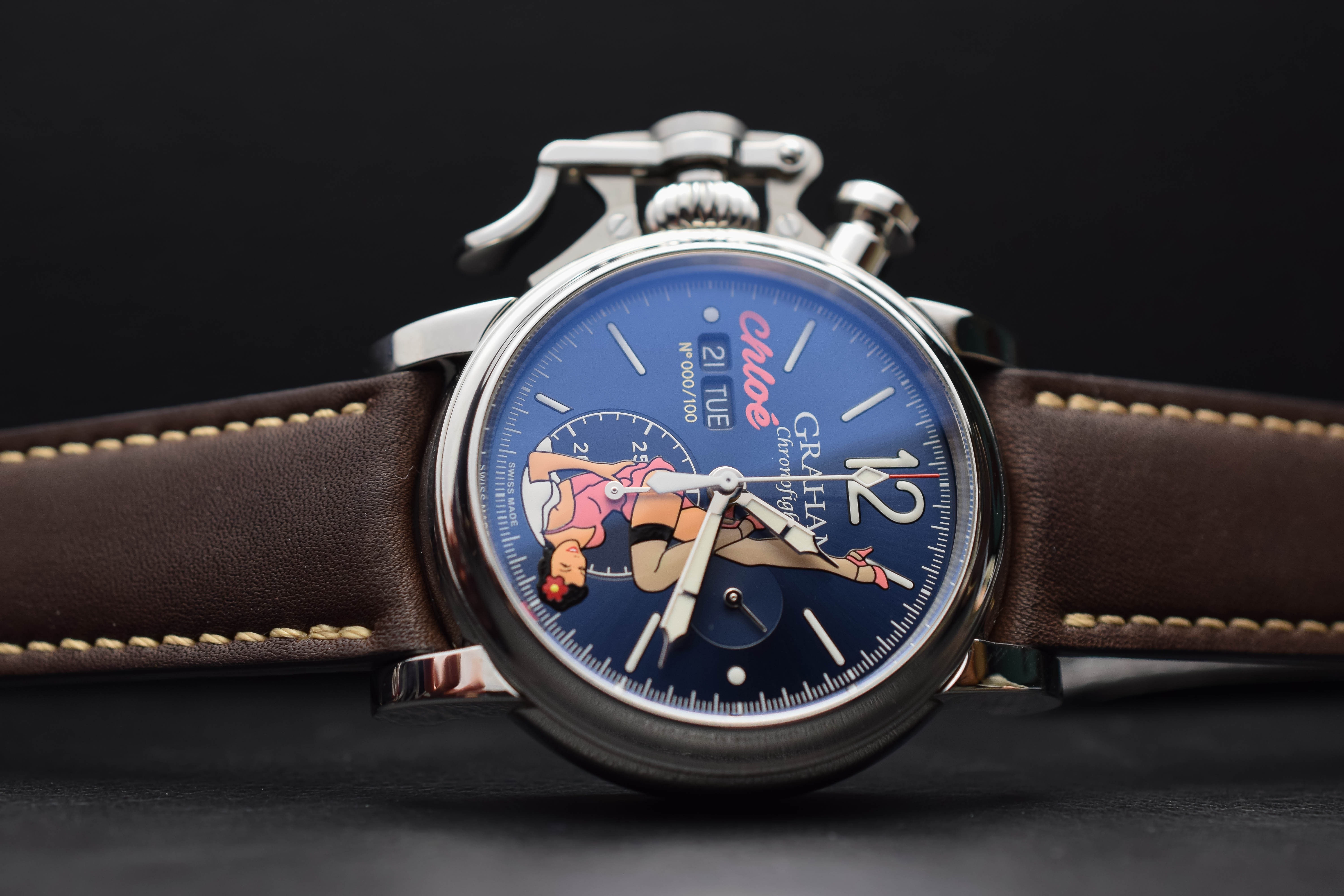 The Graham Chronofighter Nose Art watches are worn on a hand-sewn calfskin leather strap with a steel pin buckle. All watches are limited editions of 100 pieces, with their individual number indicated on the sun-brushed dial at 9 o’clock, just under the date. Price is set at CHF 5,450. For more information, visit www.graham1695.com.