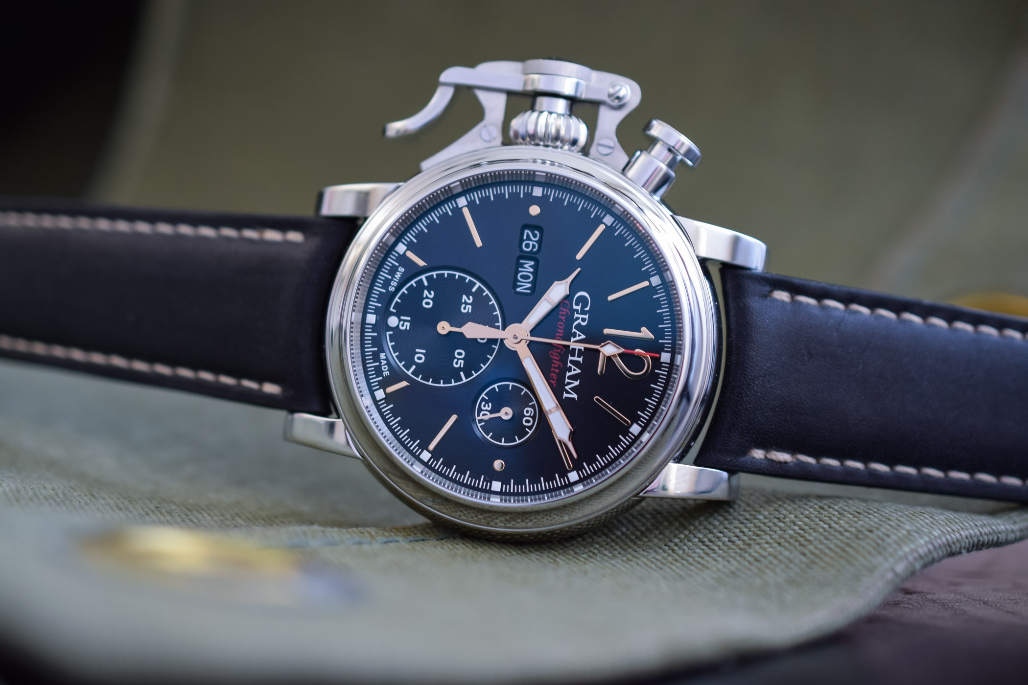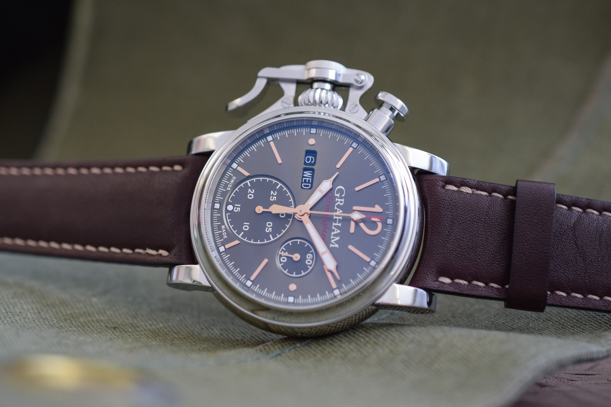 Equipped with a G1747 automatic chronograph movement, based on the reliable Valjoux 7750, the calibre is visible through the caseback and offers a power reserve of 48 hours and water-resistance to 100 metres. The reliable cam-and-lever chronograph operates at 28,800 vibrations per hour and has been slightly modified to meet with the specific chronograph pushers of this Graham watch.
