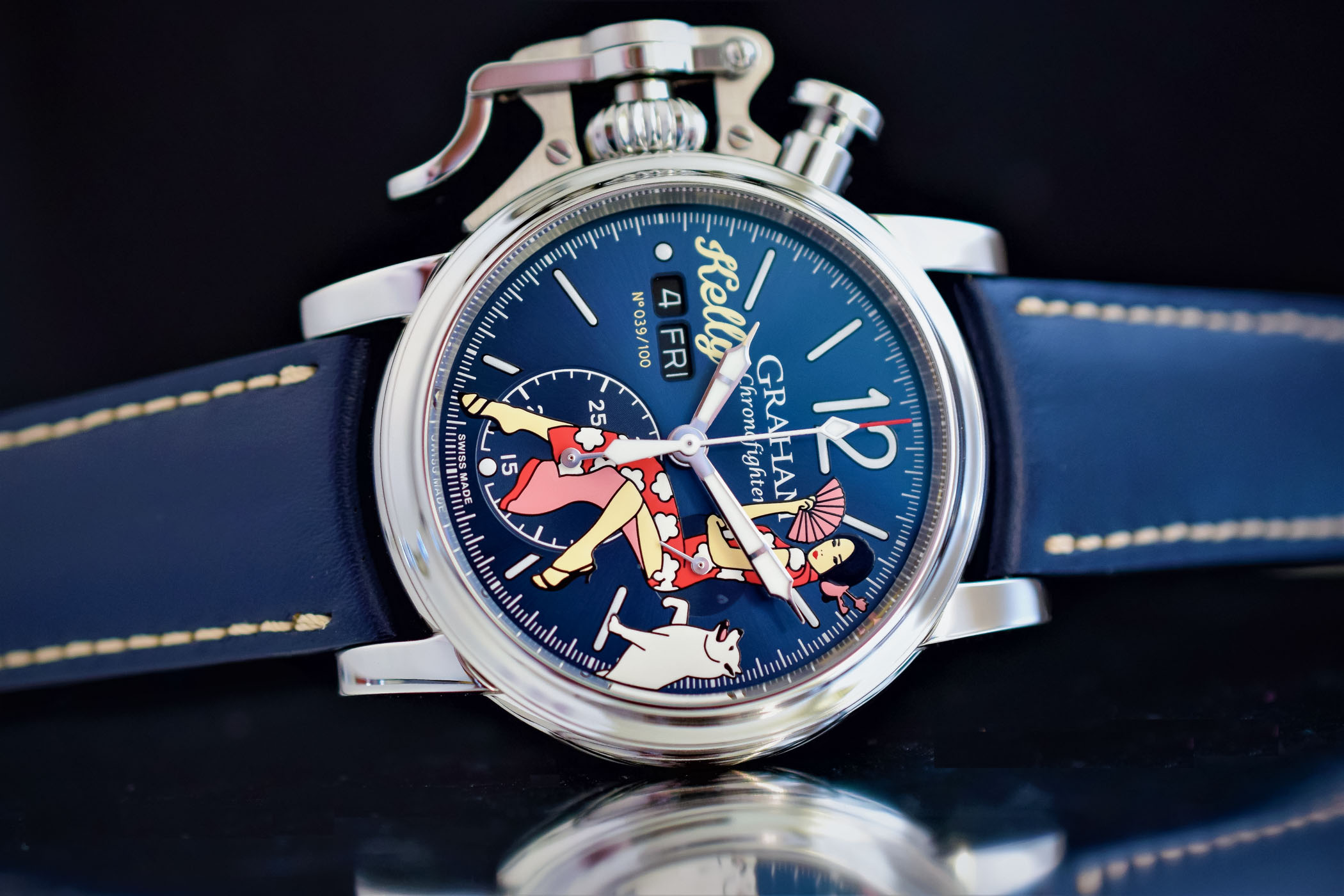 Nose-art is a decorative painting on the fuselage of an aircraft. Its most common representation is linked to WWII aircrafts and the pin-ups painted on the nose of military planes. Guys, let’s admit it, it is way cooler than a military identification number to recognize one’s plane… Specializing in the creation of aviation-inspired watches and in an attempt to capture the bygone glamour of the 1940s, Graham has incorporated pin-ups on the dial of its emblematic Chronofighter.