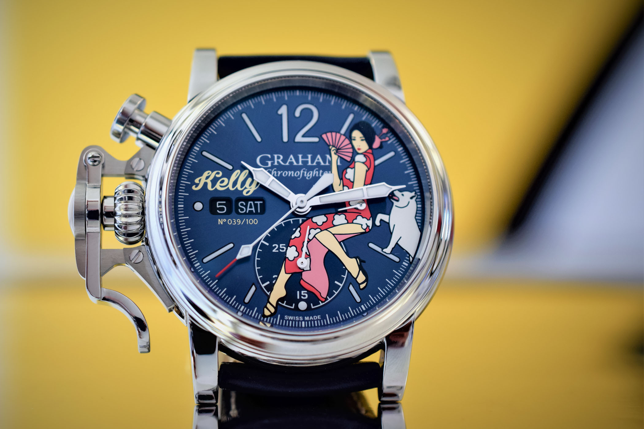 Graham introduced its successful Nose Art concept at Baselworld 2017 with a series of four pin-ups: Sally, Anna, Lilly and Nina. Merry was unveiled at the occasion of Christmas. It is now time for the charming Kelly to join the brand’s pin-up squad and enjoy the limelight on the blue dial of a Chronofighter. Unveiled to coincide with the Chinese New Year, Kelly is Asian, she wears a long red floral dress, and she is accompanied by a dog, the symbol of 2018 in the Chinese calendar. Legibility is not optimal, but it is bold (like all Grahams) and cool.