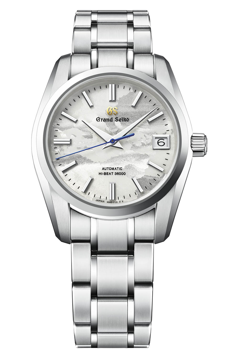 This anniversary edition with a silvery-white dial recreates the sea of clouds that blanket Mount Iwate at daybreak. To create the mottled dial pattern, GS artisans used electroforming. The central seconds hand is tempered in blue, and the Grand Seiko logo is applied in a gold colour to commemorate the 25th anniversary of the 9S movement.