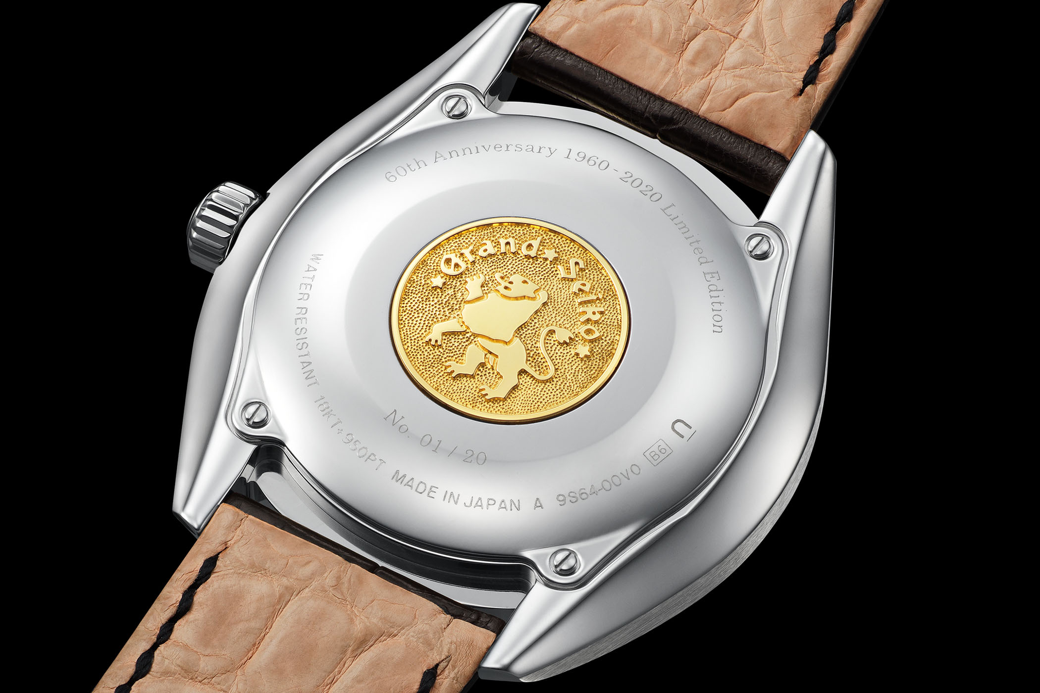 The 39mm platinum case has a height of 11.8mm and features the spectacular mirror-polished, distortion-free finish we associate with GS watches. The reverse side of the sealed caseback protecting the manual-winding movement has an 18k yellow gold Grand Seiko lion. The platinum Grand Seiko 60th Anniversary Limited Edition SBGW263 is produced in just 20 pieces and will retail for EUR 101,000.