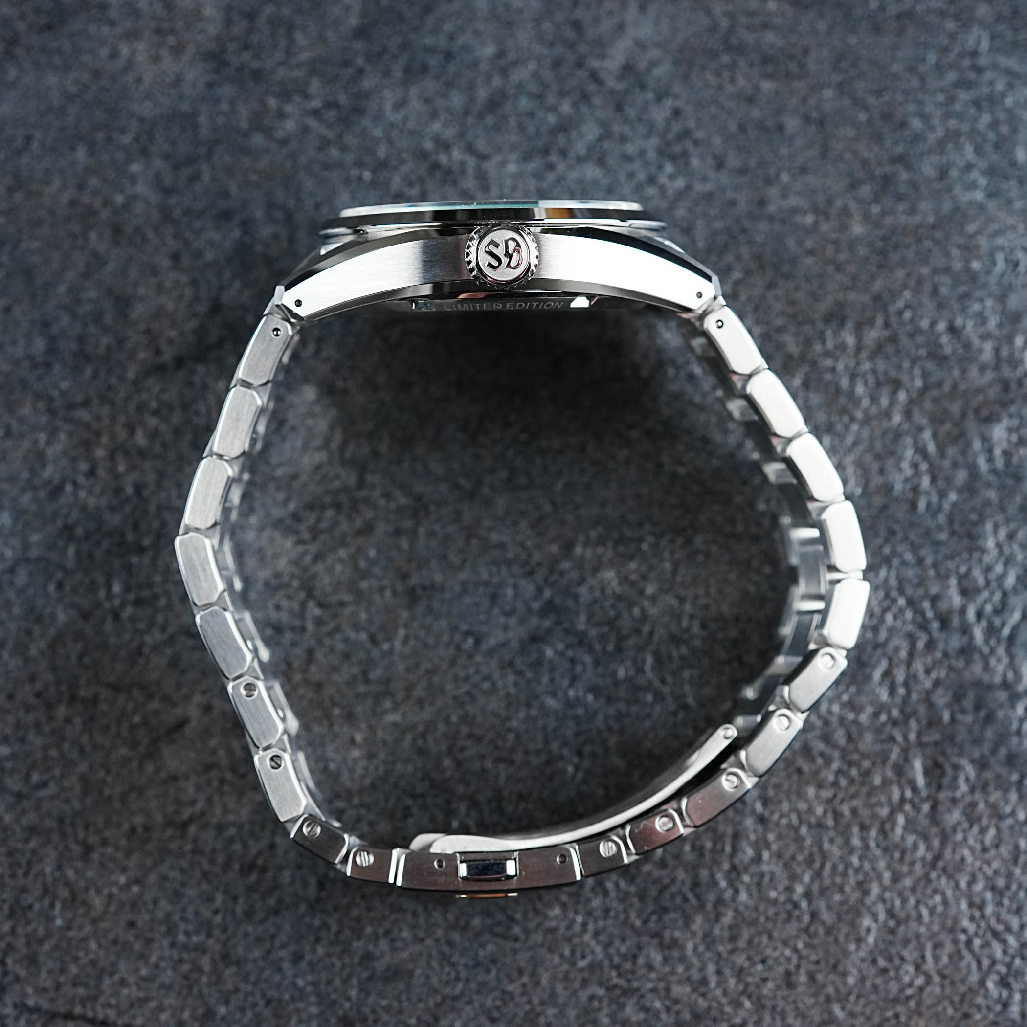 Identical in size and technical specifications to the earlier SLGHxxx variants, the new SLGH021 Genbi Valley has a 40mm diameter, a thickness of 11.7mm and a 100m water-resistant case. With its leaner silhouette and gentle camber, the new Evolution 9 Style case design has a lower centre of gravity and sits closer to the wrist. The case and bracelet are, however, made of Ever-Brilliant steel, a proprietary GS metal that is one of the most corrosion-resistant steel alloys and is 1.7 times harder than stainless steel. Ever-Brilliant steel is also brighter, and following the signature Zaratsu polishing applied to the case, the wide hairline finished areas enhance the bright, distortion-free, mirror-polished surfaces.