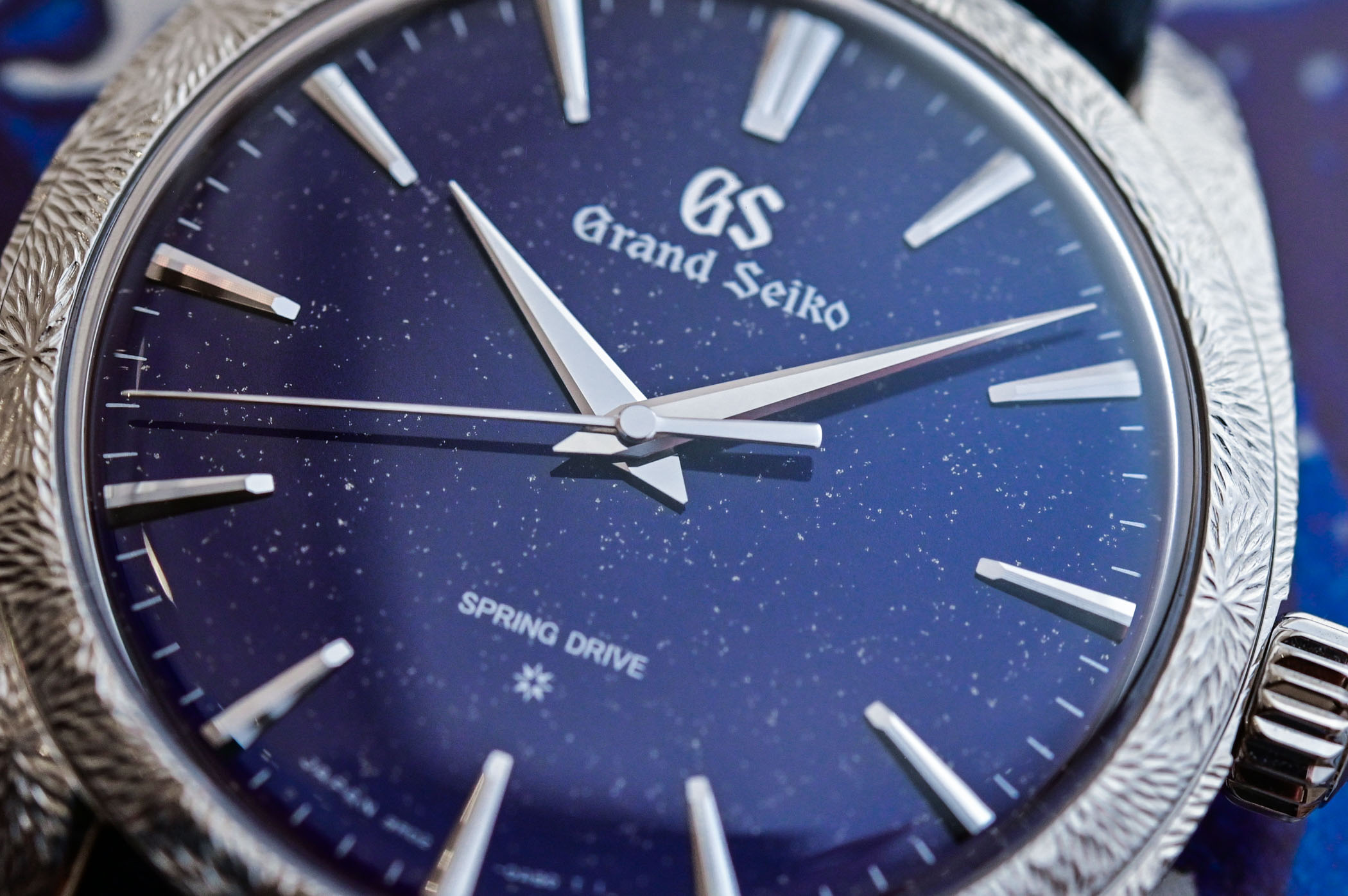 Albeit identical mechanically, the decoration and design play with different inspirations. In true Grand Seiko tradition, this new Masterpiece watch is once again inspired by Japan, nature and the environment surrounding Grand Seiko’s manufacture. For this watch, the Micro Artist Studio’s designer Kazunori Hoshino took inspiration from the night sky above Achi, up in the mountains of the southern part of Japan’s Shinshu region, a village that is famous for its spectacular night skies. Hence this new deep blue star-speckled dial.