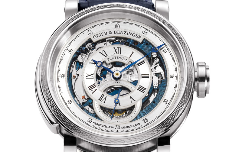 After the skeletonization and guilloché, the base plate was coated with blue platinum, a signature element of every single unique Grieb & Benzinger piece that was created. The skeletonized sterling silver dial was embellished with a Breguet frosted finish, using the classic method, which is only presently practiced in this manner at Grieb & Benzinger. Furthermore they made the secretly hidden tourbillon visible through the dial. The entire work took 15 months, which was necessary to get all 336 individual components treated in the typical Grieb & Benzinger characteristics.