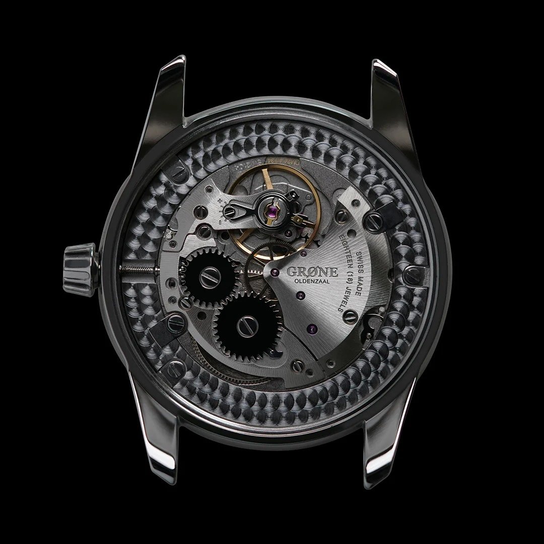Don’t expect the Grøne Manueel One to feature a complex and intricately finished movement in the typical style of the Grönefelds, as it is aimed at a very different audience. Hidden under the engraved caseback is a hand-wound Sellita SW210. This manual evolution of the SW-200 runs at 28,800 vibrations/hour and boasts 42 hours of power reserve. Time is indicated by central hour, minutes and seconds hands, with a hacking function for the seconds to enable a precise setting of time. The brothers state that the movement has been torque-adjusted to a “just right” crown-winding feel, as preferred by Tim and Bart. What that means in reality remains to be experienced.