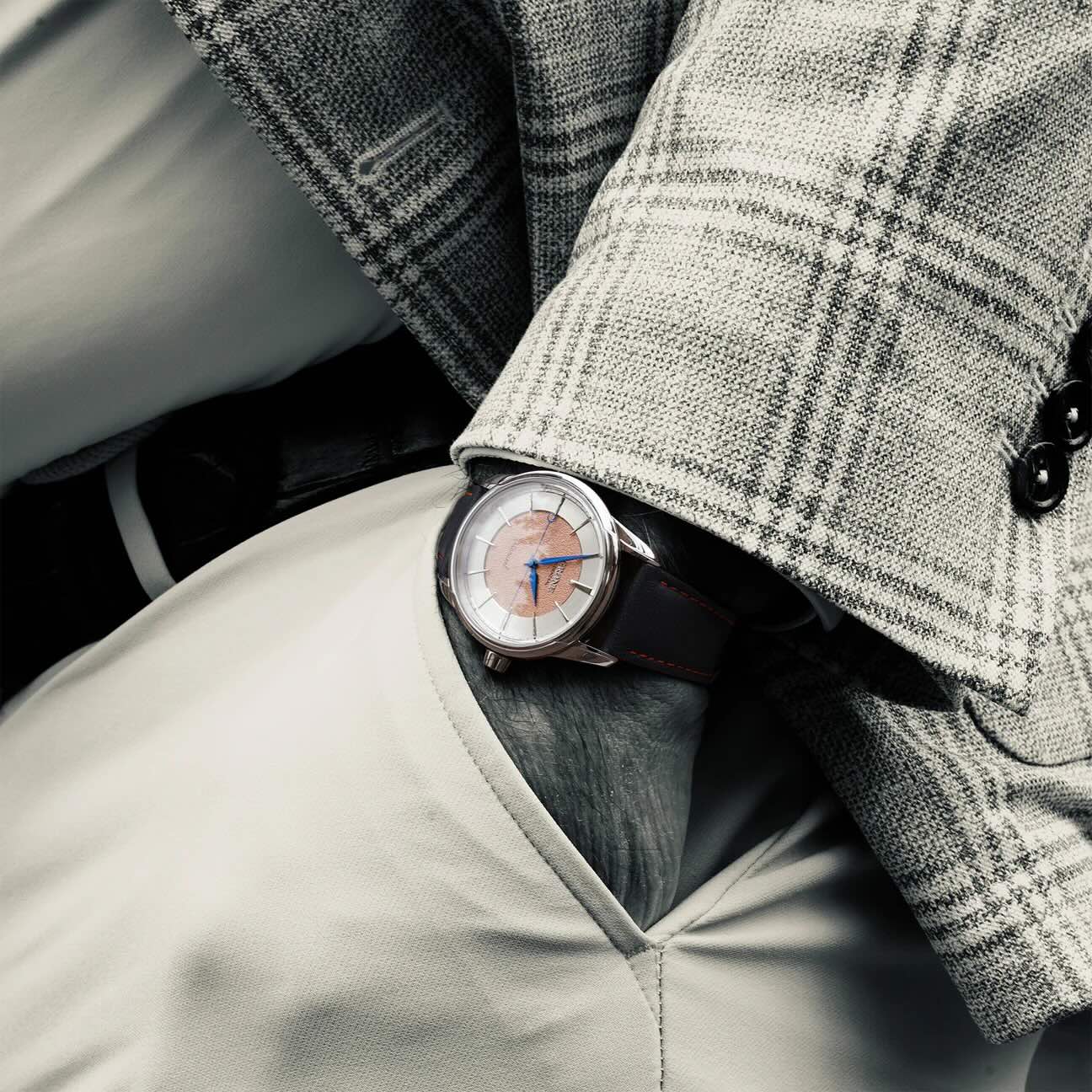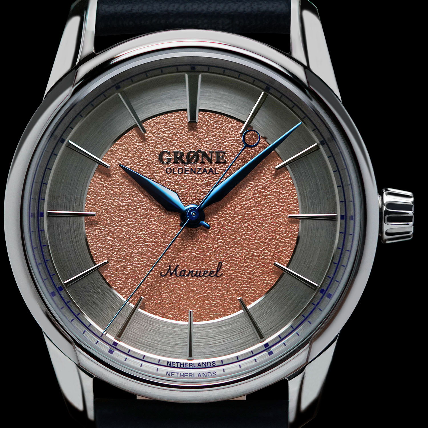 The dial looks quite stunning, with multiple levels and plenty of detail. It starts with a salmon-toned centre with a tremblage-like finish – it is most likely stamped instead of hand-executed, given the Grøne Manueel One’s price point. The outer ring has two levels, one for the blue minute track on the very edge, and a broader section for the hour polished hour markers. The markers themselves extend over the edge of the ring, floating above the salmon centre for a touch of depth and refinement. The hands are made from polished stainless steel in a vibrant blue tone and paired with an applied Grøne Oldenzaal logo. The words “Oldenzaal”, “Manueel” and “Netherlands” are printed with the same shade of blue as the hands.