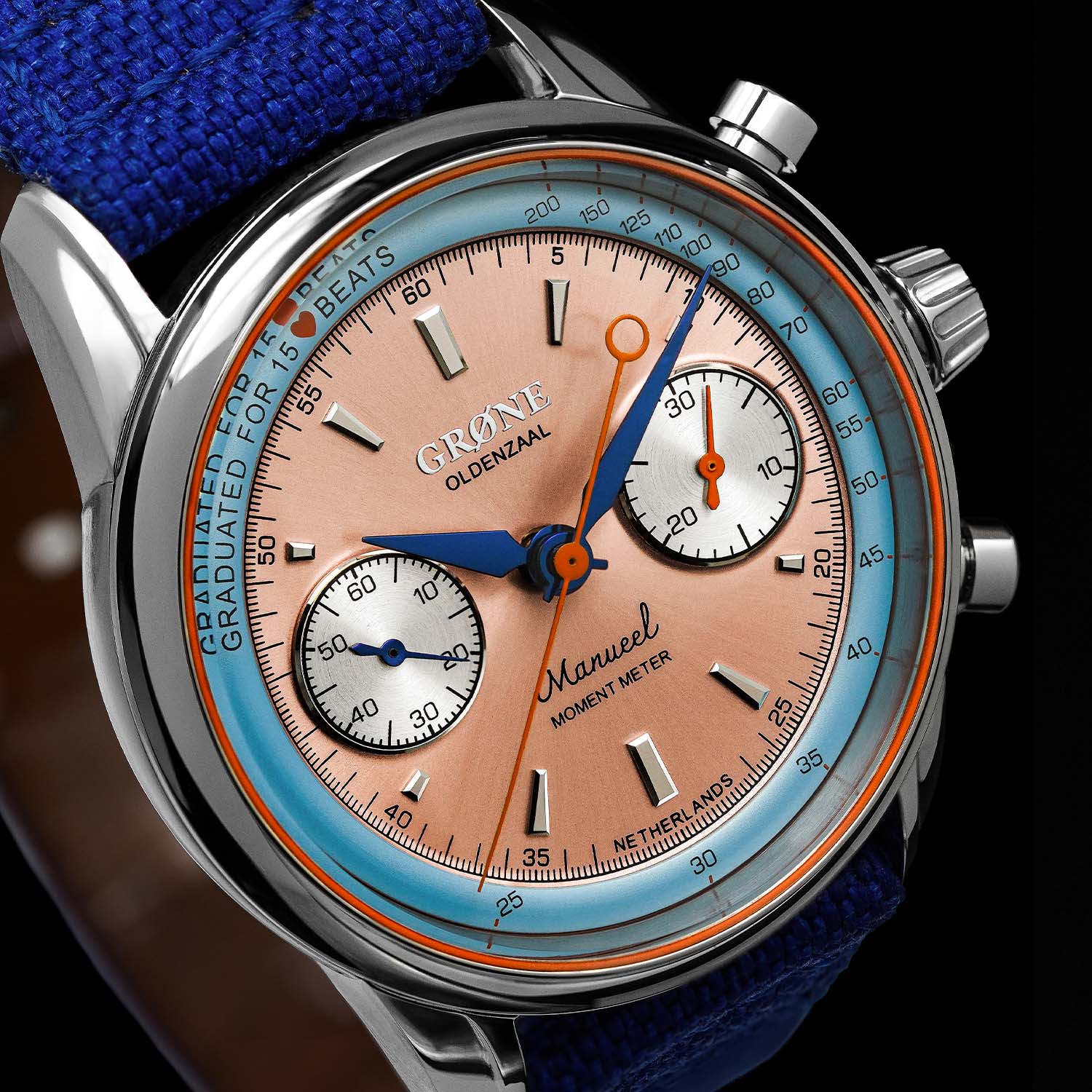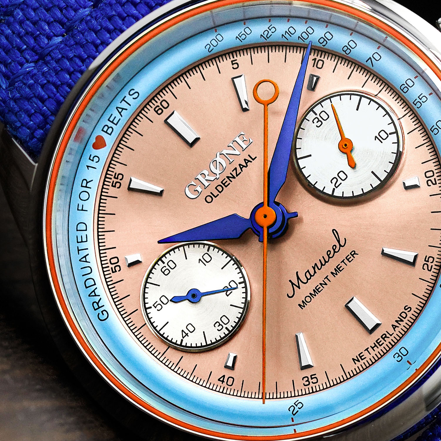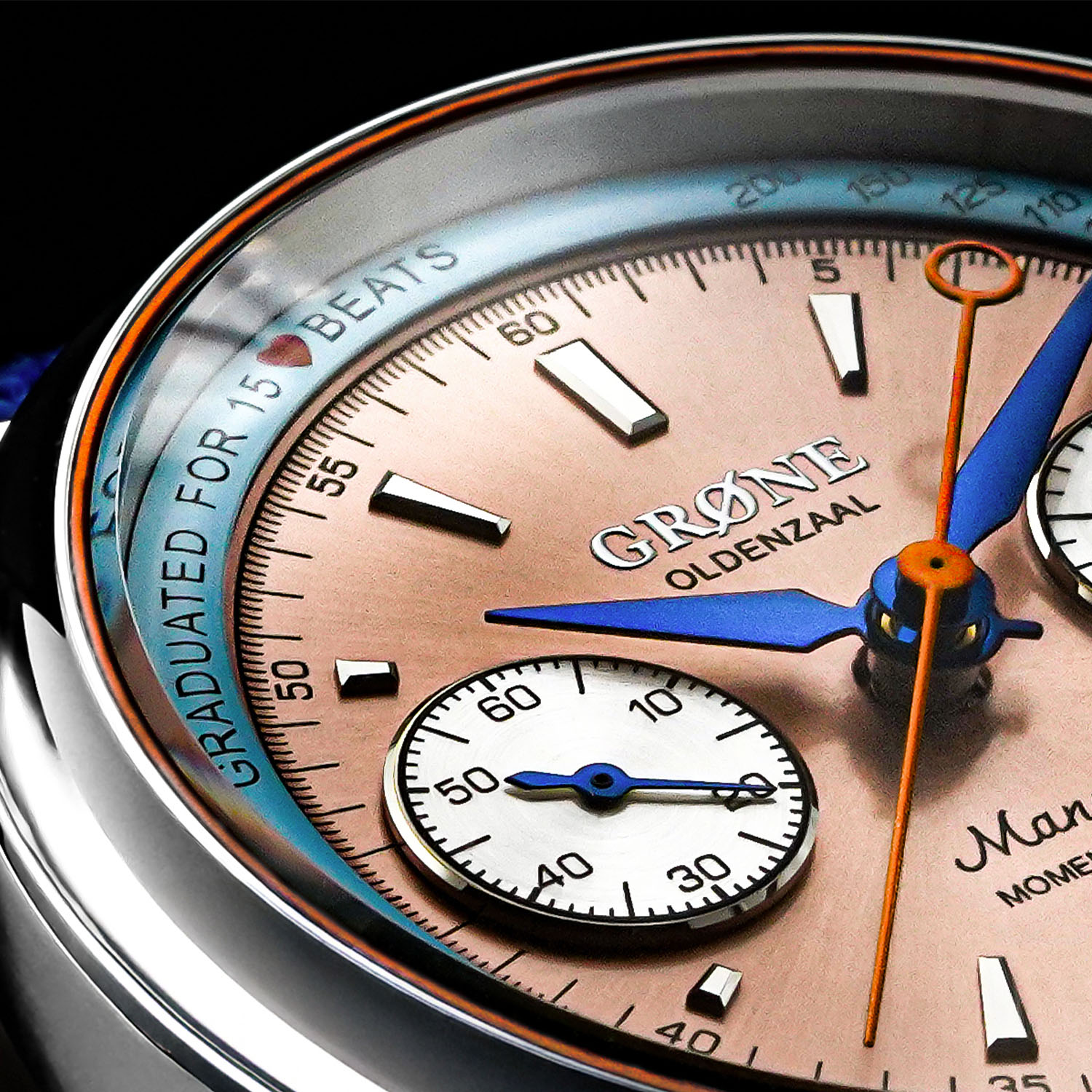 Turning our attention to the dial, the Grøne Oldenzaal Moment Meter once again has clear Grönefled DNA, with a lower plate with sunray-brushed salmon finish and trapezoidal diamond-cut polished steel hour markers (again, classic 1941). Just like Grönefeld’s own chronograph, the superb 1941 Grönograaf, the sub-dials of the Moment Meter are built on raised, concave and convex plateaus, with rhodium plating and classic 1941 tracks. The same goes for the blued hour and minute lance-shaped hands; however, the chronograph hands are finished in orange. The periphery of the dial is home to a pulsometer scale, printed on a baby-blue backdrop with a fun heart detail…Like it or not. The dial is completed by a 1/5th of a second scale, even though the movement runs at 4Hz.