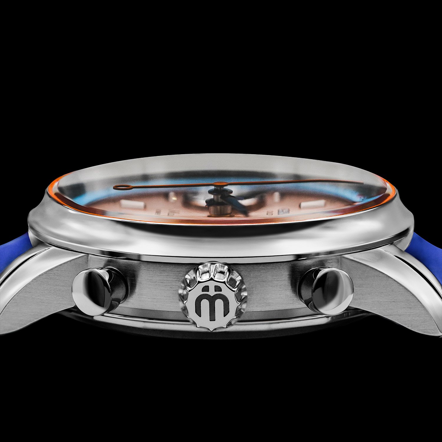 Under the sapphire caseback is a well-known movement sourced from La Joux-Perret. A hand-wound chronograph based on the emblematic Valjoux 7750 architecture, it is now equipped with a column-wheel and boasts an enhanced 60-hour power reserve. The movement is lightly decorated with perlage on the lower plate and Geneva stripes on the main bridge.