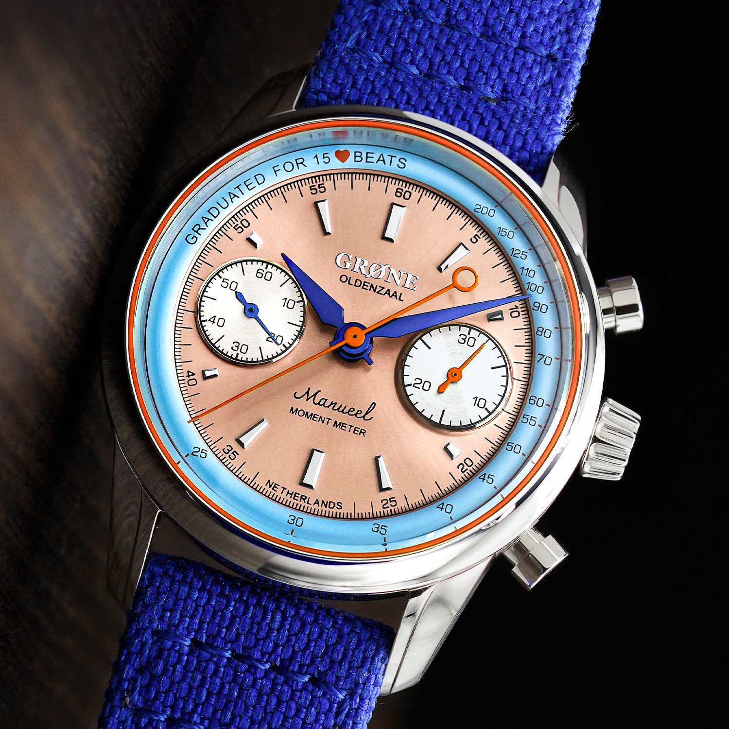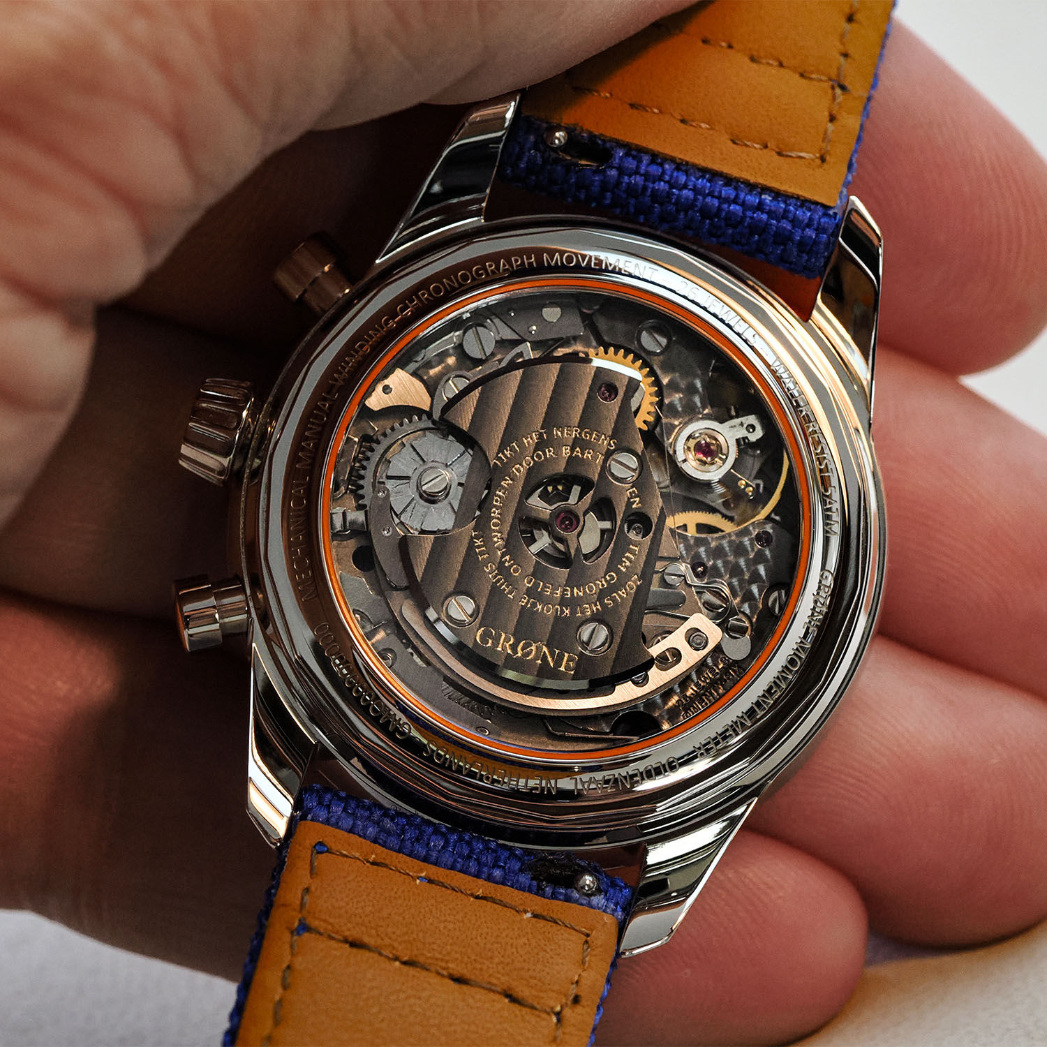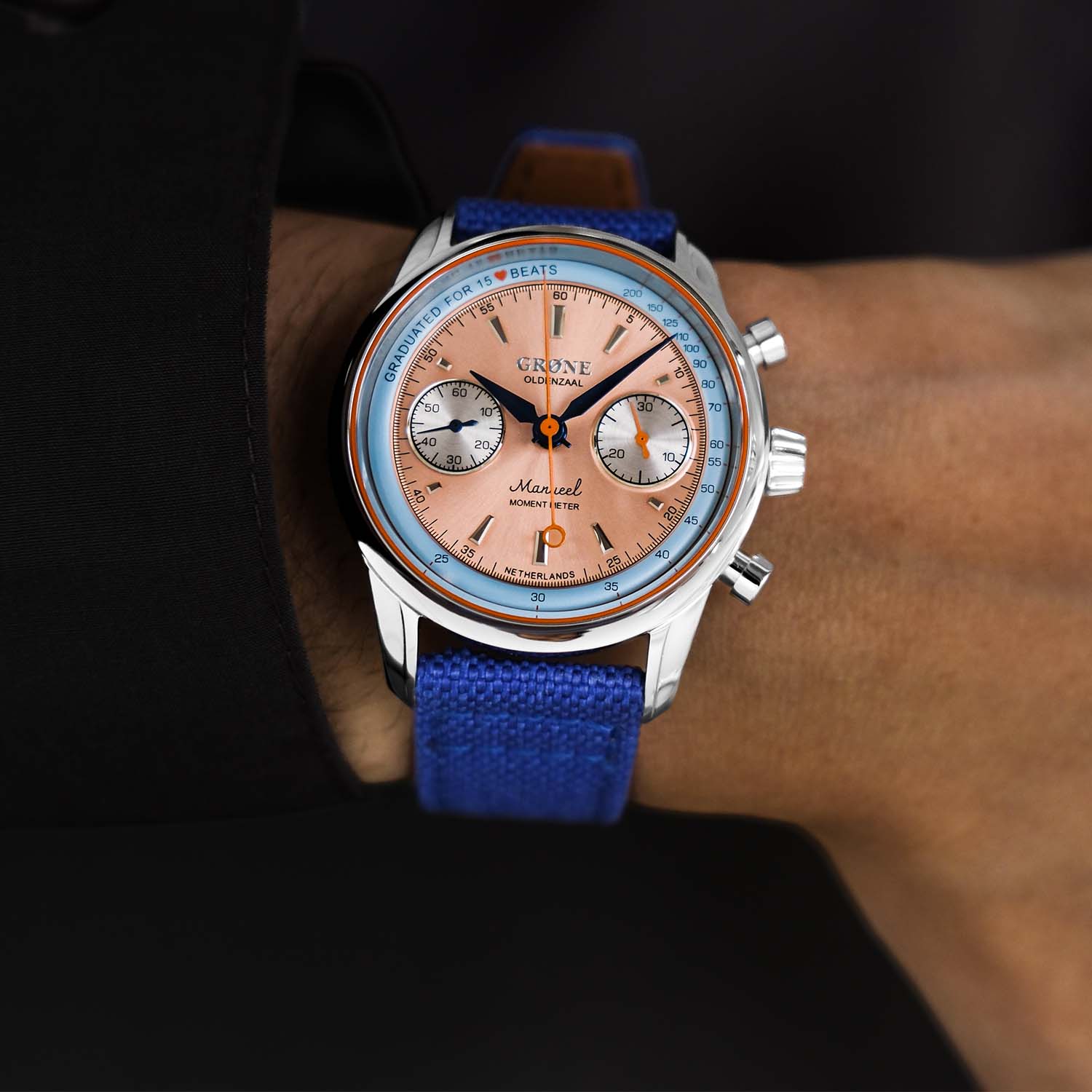 The Moment Meter is, otherwise, fairly traditional, with a mix of vintage cues and modern architecture. There are sapphire crystals on both sides of the watch, with a decent water-resistance of 50m. The sides of the case are brushed and home to classic pump pushers. One detail, however, brings personality and visual boldness: the sapphire crystals on top and back are paired with specially made orange gaskets, adding a touch of Dutch-ness to the watch. Necessary…? Maybe not, but at least different.