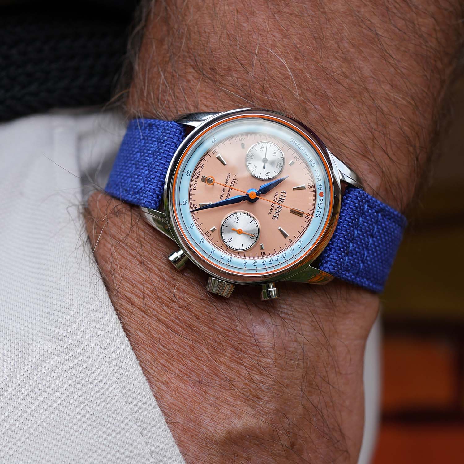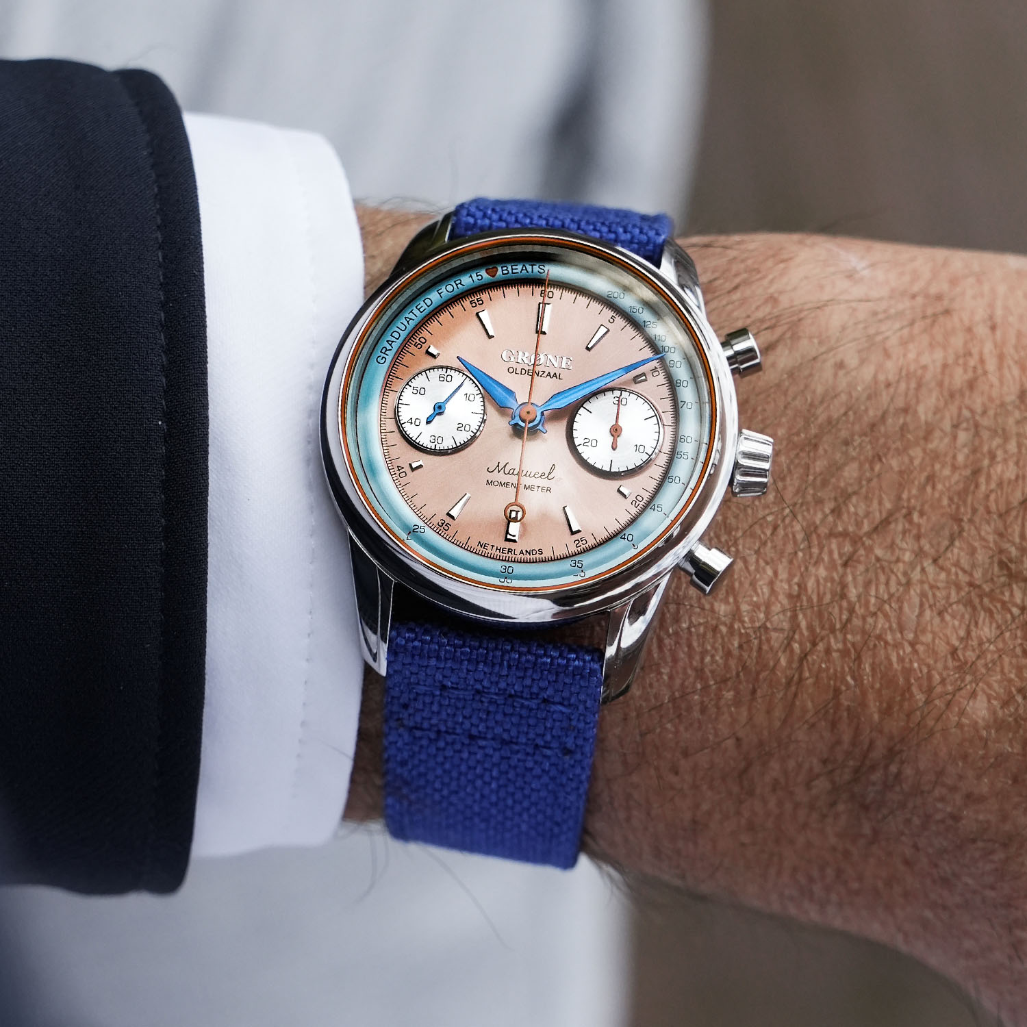 Worn on a 20/18mm nylon sailcloth strap in a vivid blue colour, the Grøne Oldenzaal Moment Meter will be available for order on 3 December 2025, at 3PM Europe Time. The watch is limited to 300 pieces and won’t be reproduced in this specific colour scheme. Deliveries are expected from January onwards. The Moment Meter is priced at EUR 3,490, excluding taxes, possible tariffs and shipping and will be available from grone.com.