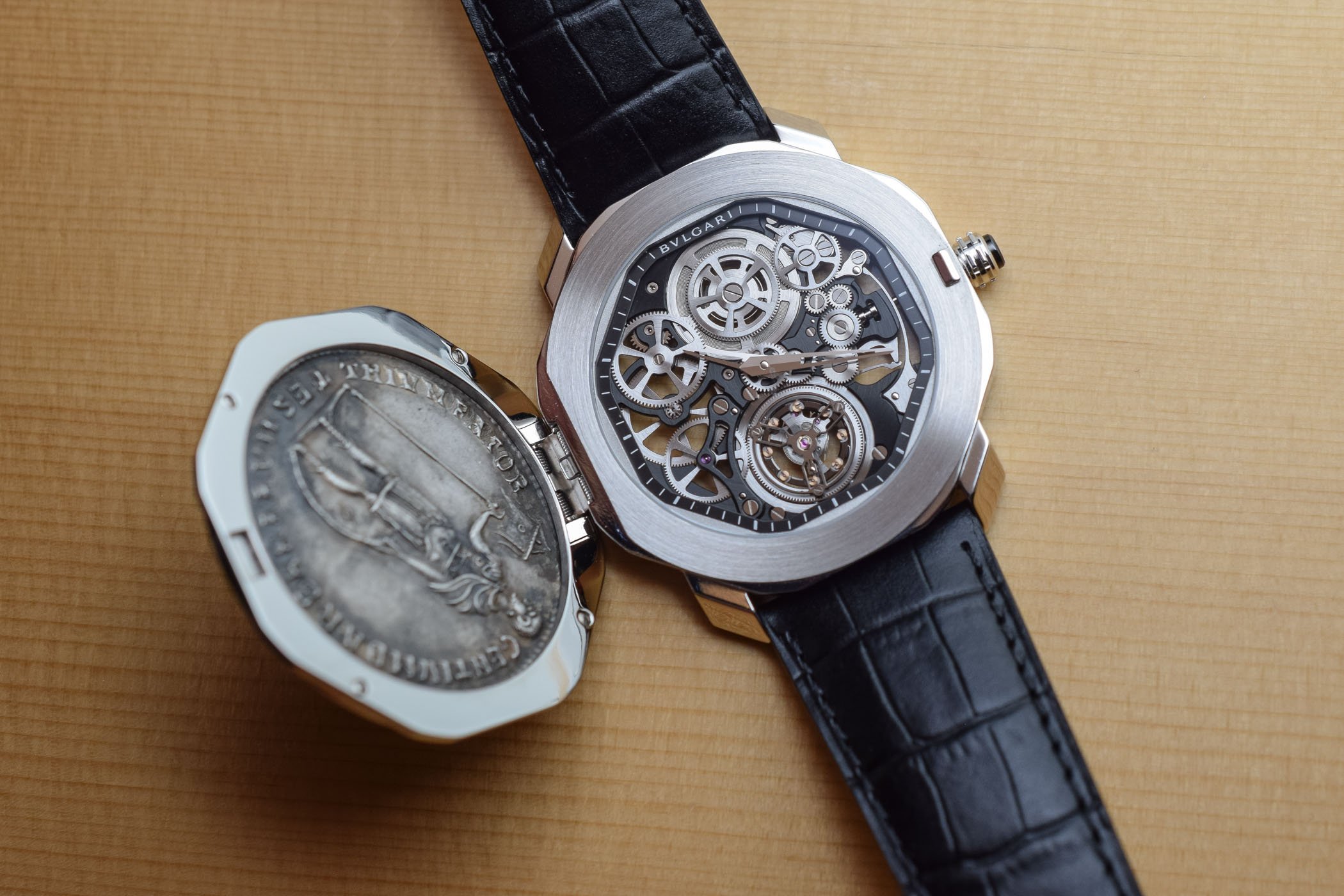 Octo Roma Monete – two editions, platinum or pink gold – 44mm x 9.75mm case fit with an ancient silver coin – hand-wound calibre BLV268 Skeleton Flying Tourbillon (1.95mm) – water-resistant to 30m – alligator strap with folding buckle