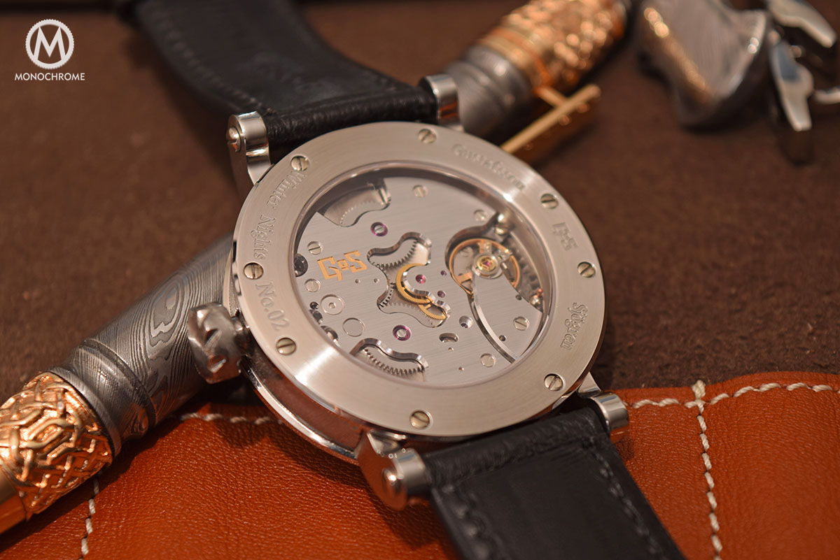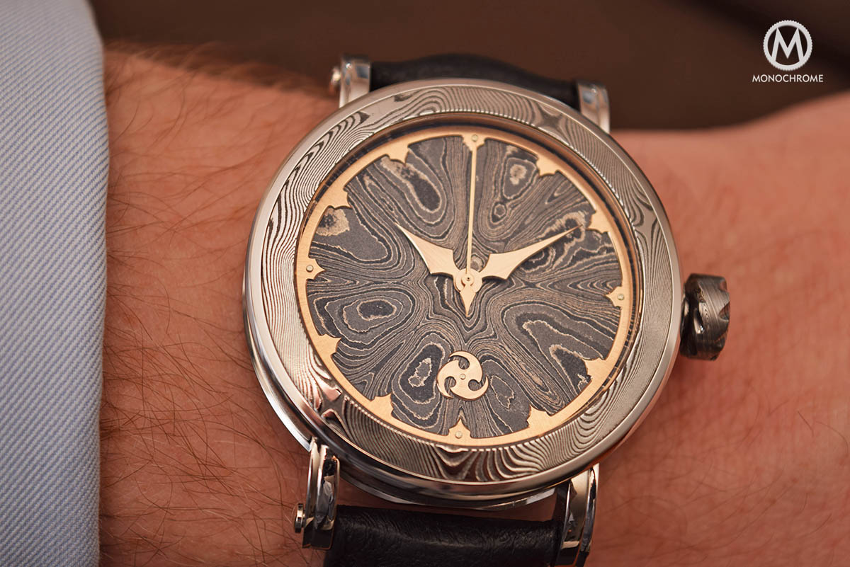 Like the cases by Gustafsson & Sjögren, the dials are always made of Damascene steel and thus unique in every way despite sharing a possible common theme. Each dial is constructed of tooling steel, which is folded and hammered over and over again until it reaches 192 layers in total. A nice touch that I didn’t know of before is that each numbered edition really is manufactured in chronological order. So, to explain, number 1 really is made as number 1, number 2 as number 2 and so on.