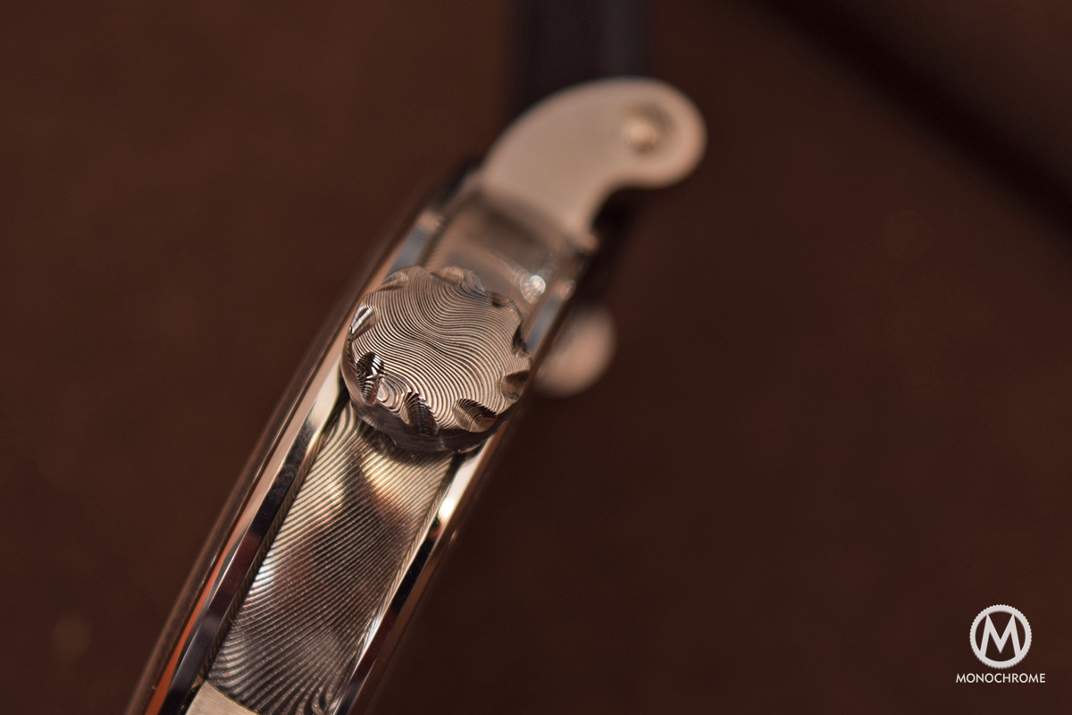 When handling a watch like this, you can really feel each individual ridge in the Damascene steel, no matter how fine they might appear. If you run your finger nail along the surface you really feel the woodgrain-like pattern of the surface. Be careful though, because “handling” can become “groping” very quickly with this timepiece and that might be socially unacceptable in some parts of the world. What becomes very apparent when looking at the entire watch is that they are very detailed and not only due to the use of Damascene steel. Everything about this watch oozes a common theme, even down to the crown which received an overhaul for this new collection. The Damascene steel crown grips very good because of the 9 hand filed edges, a detail first used in 2008 but re-introduced in current collections.
