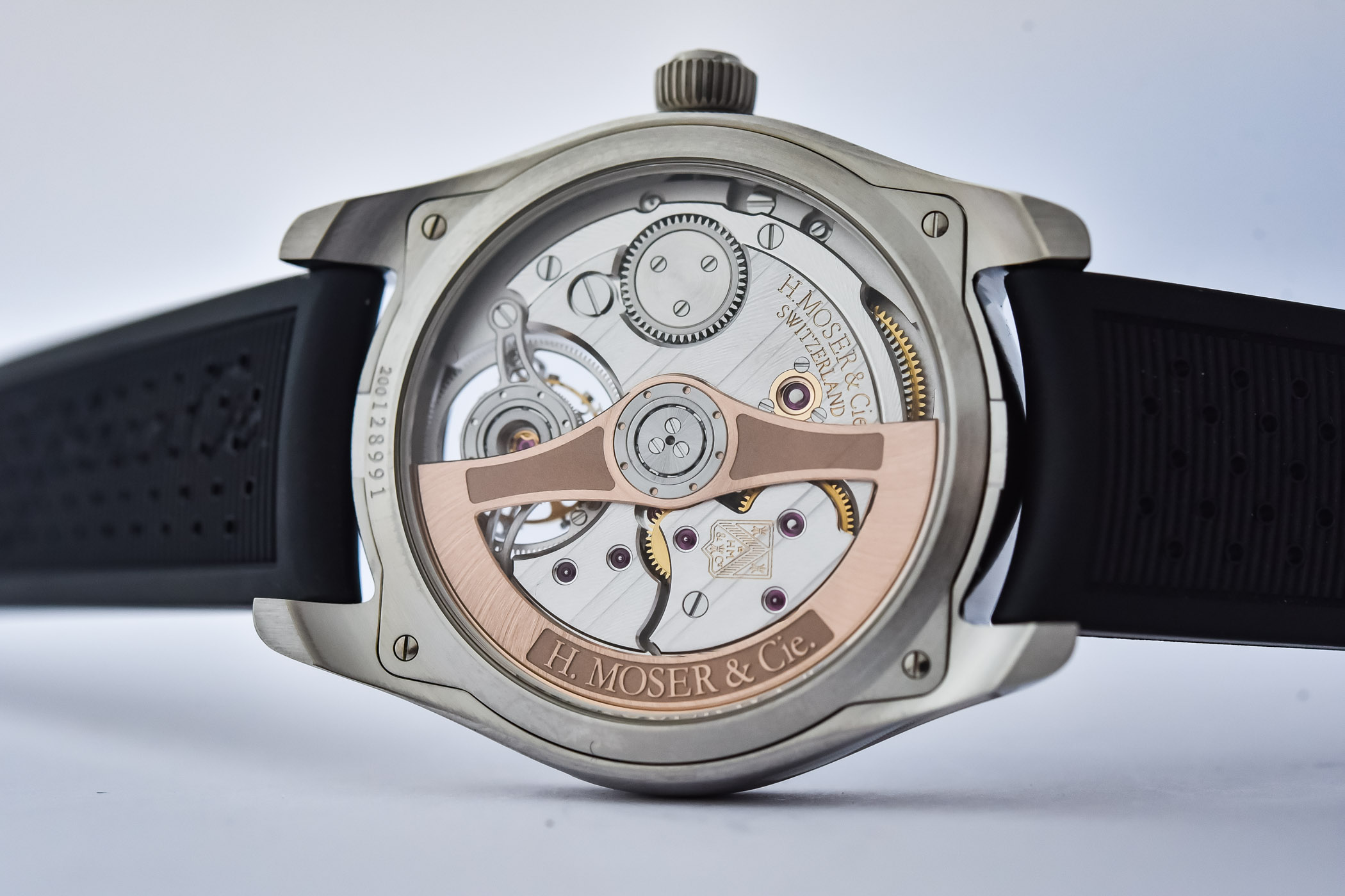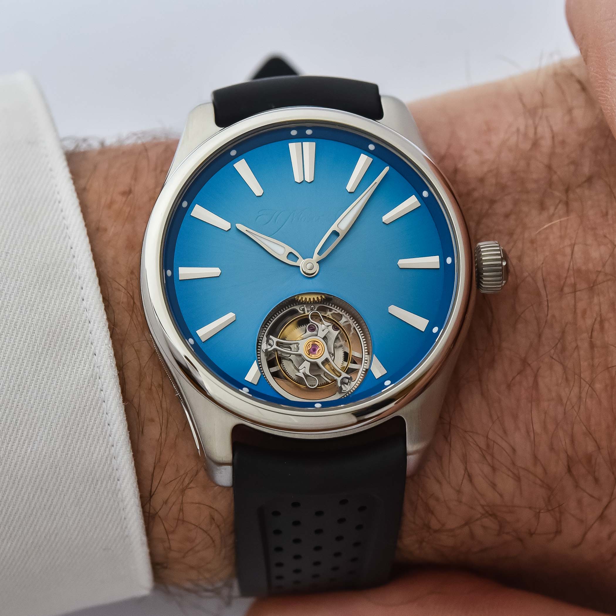 Quick Facts – 40mm x 12mm – stainless steel case, brushed & polished – sapphire crystal front & back – 120m water-resistant – arctic blue fumé dial – transparent lacquer H. Moser & Cie logo – applied indices & hands with Super-LumiNova – Calibre HMC 804, in-house automatic – 28 jewels – bi-directional pawl winding system – 21,600vph – exposed tourbillon escapement – double-hairspring – 3-day power reserve – rubber, textile or leather strap or steel bracelet – CHF 49,900