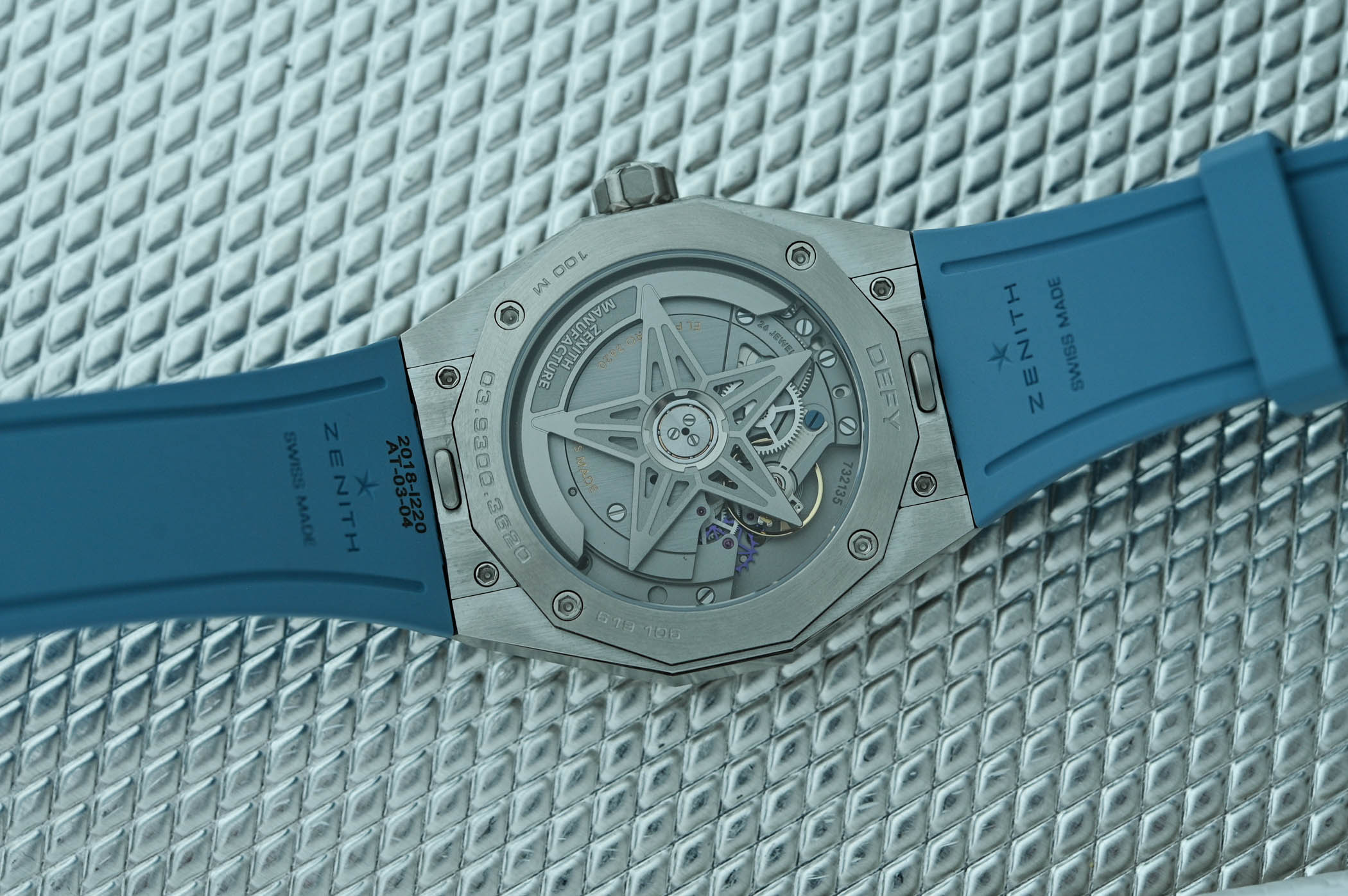 Quick Facts – 41mm x 11.6mm – stainless steel case, brushed & polished – octagonal case with 12-sided bezel – sapphire crystal front & back – 100m water-resistant – ice-blue starry dial with applied indices & hands with Super-LumiNova – El Primero 3620, in-house automatic – 36,000vph – 26 jewels – hours, minutes, 1/10th of a seconds, date – integrated steel bracelet and ice-blue leather strap – CHF 8,900