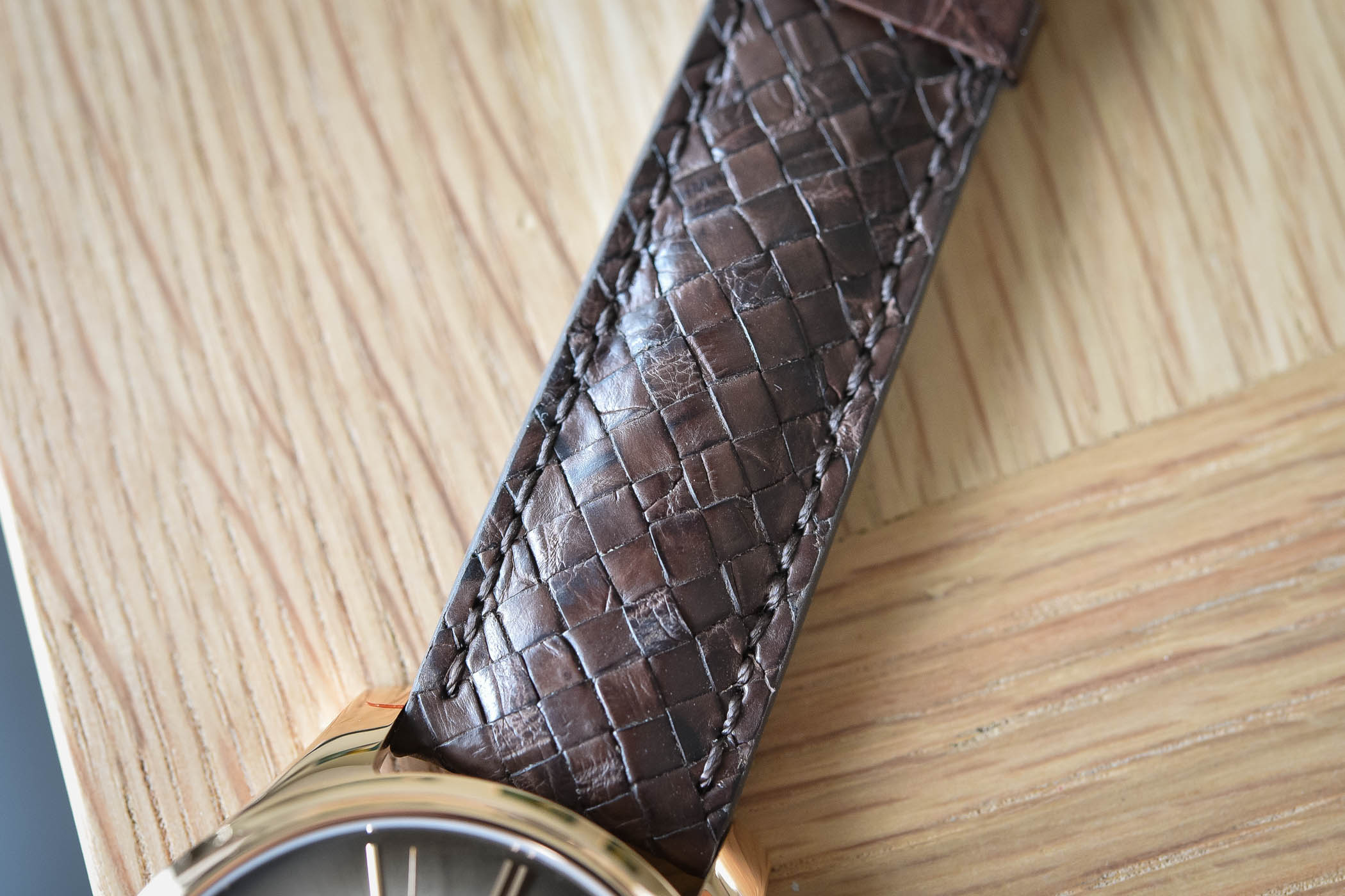 The red gold Endeavour is an entirely different kettle of fish. The combination of warm red gold and the signature fumé dial (which can best be described as a champagne-grey colour, depending on the light) and the handsome plaited leather strap, lends this watch a more stylish, suave personality, almost Italian in appearance. In a nutshell, the red gold model exudes a sleek, man-about-town kind of look that contrasts with the more laid-back personality of the funky blue white gold model.