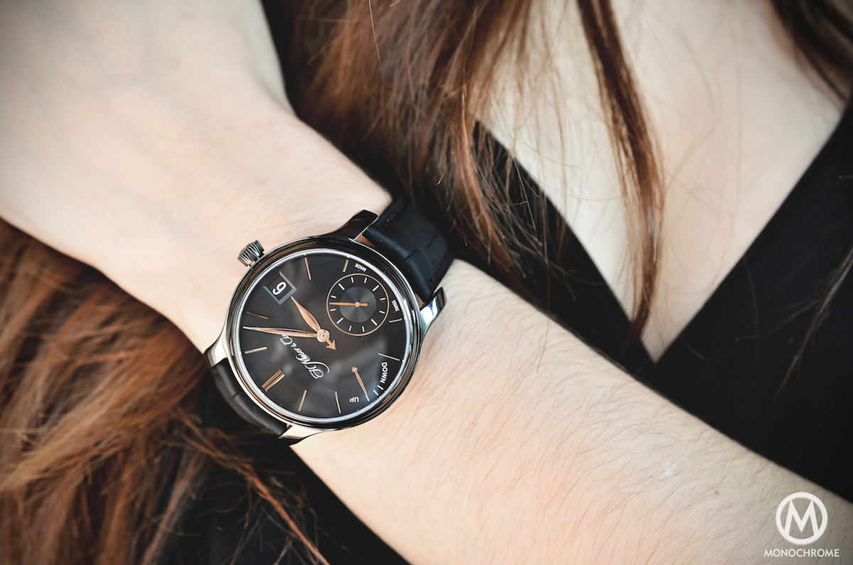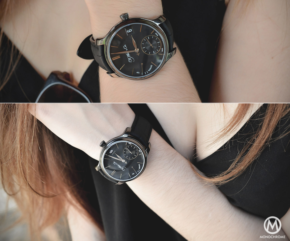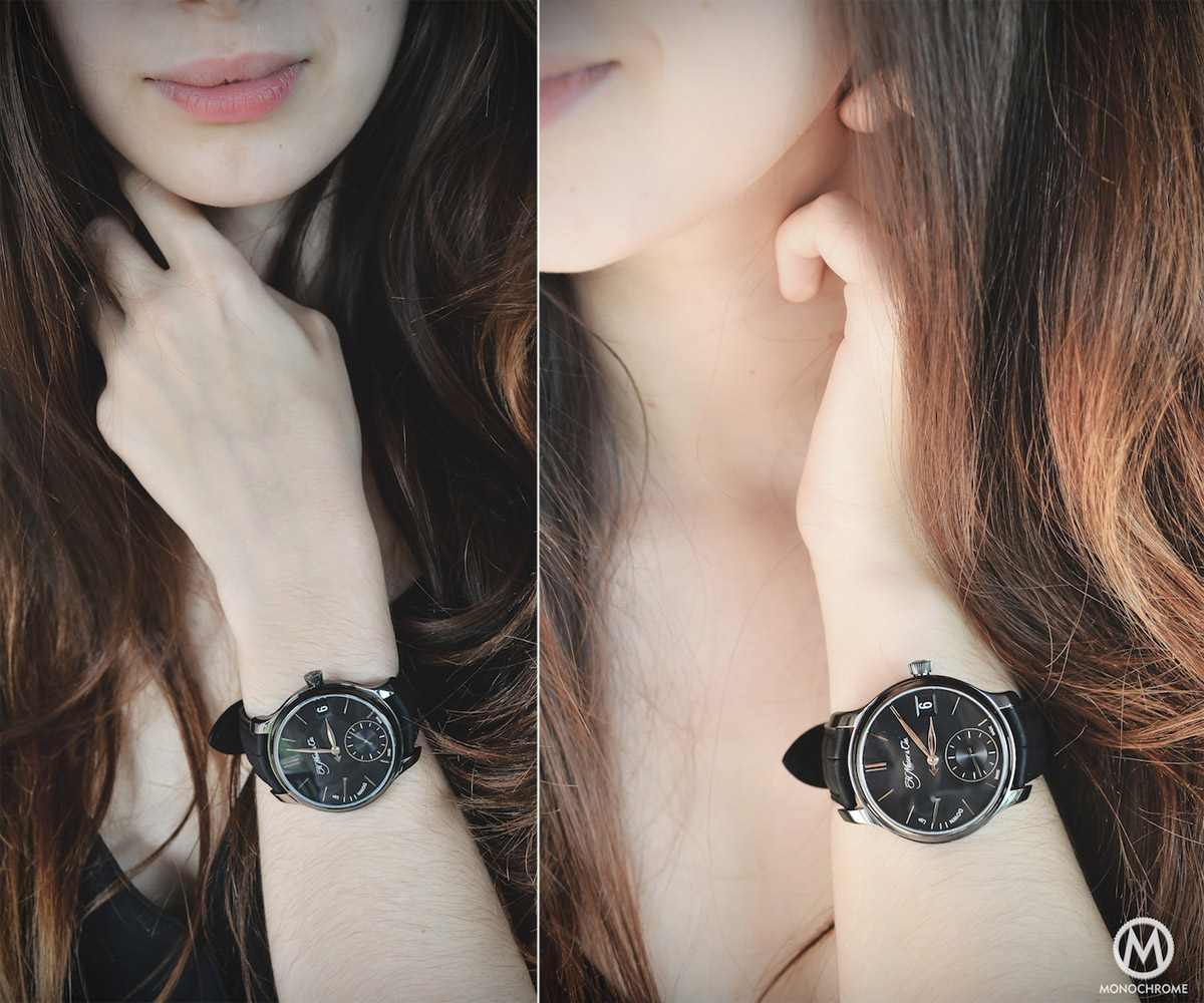 It’s not that we have something against women’s watches here at Monochrome, but in a sense, we don’t know how to talk about them. So for once, we gave the Endeavour QP a try. More and more ladies are now wearing mens watches (and we fully understand why) and the Moser looks extremely good on an elegant feminine wrist. I was even surprised to admit that it was nicer on her than on me.