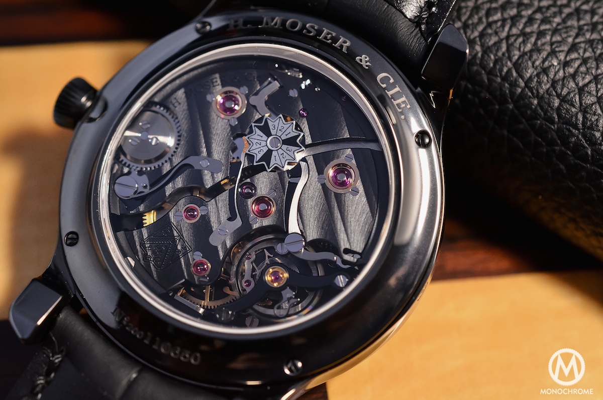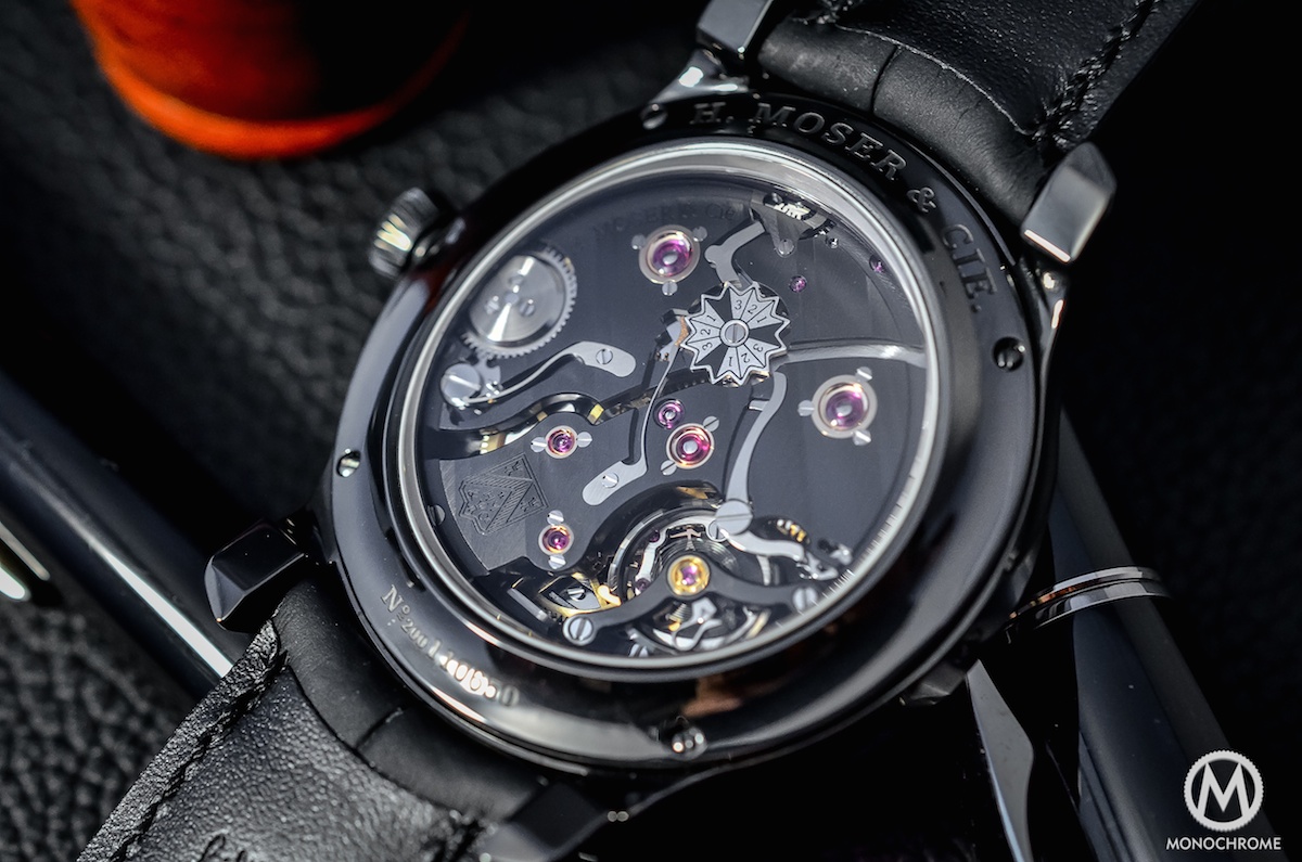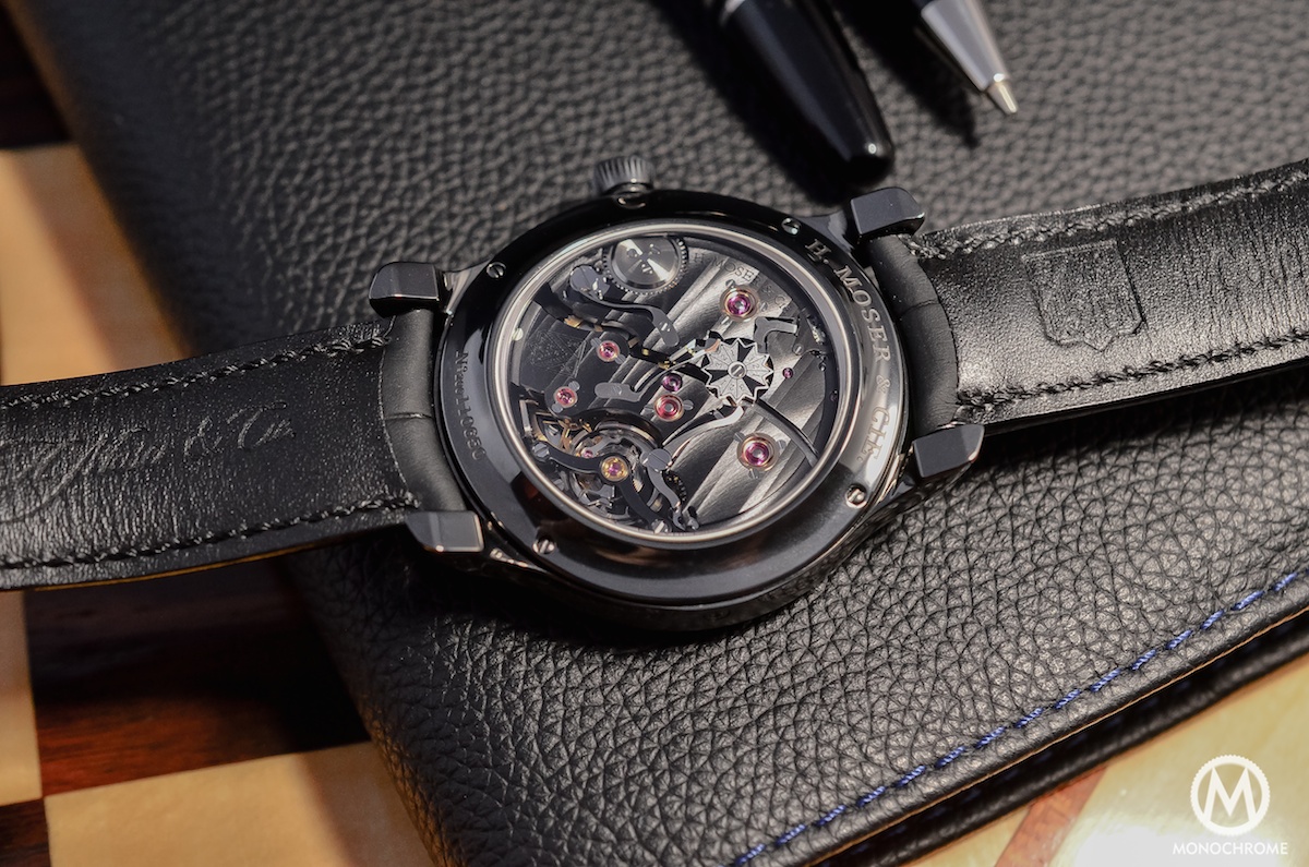 The movement is also reasonably sized, with 5.8mm in height only and 34mm diameter. To match the black colour of the case, the bridges are also coated in black. It allows a great contrast with all the steel elements and the oversized screwed gold chatons. The bridges are chamfered with polished bevelled angles, adorned with Moser stripes (a double Geneva stripe) and mostly hand finished. This movement is extremely nice to look at, clever, powerful and technically impressive. The teams of H. Moser worked hard to bring this piece of mechanical art.