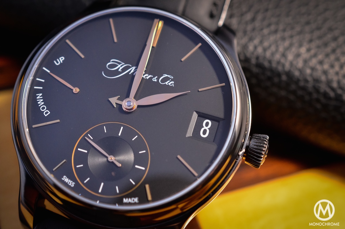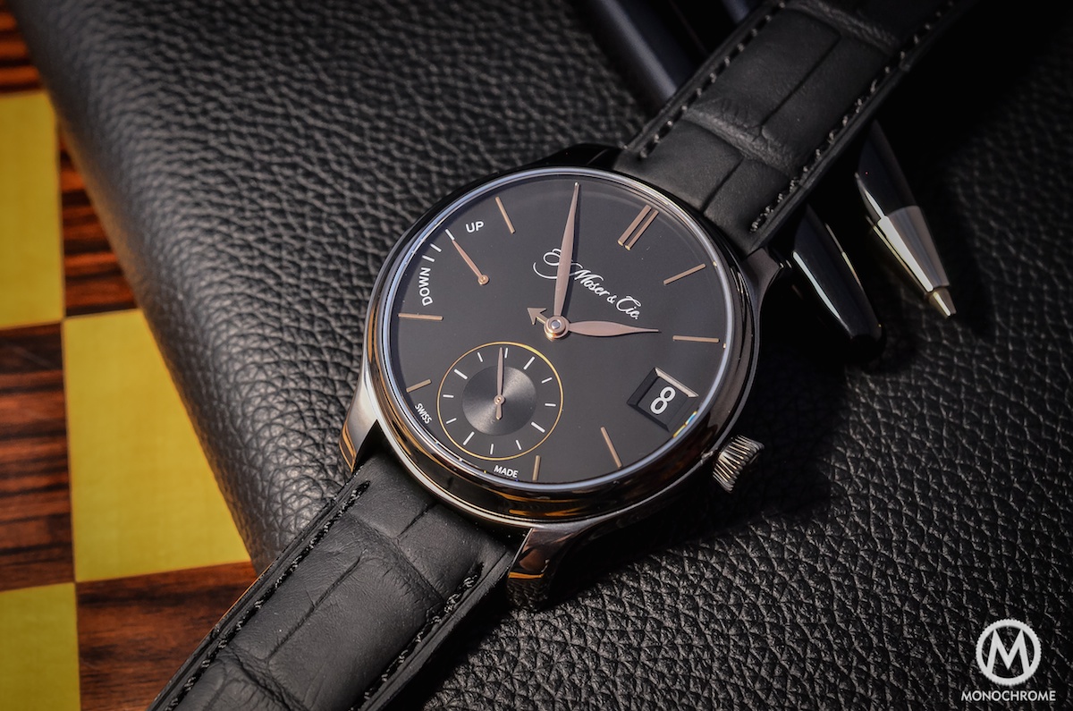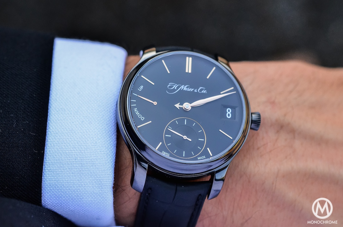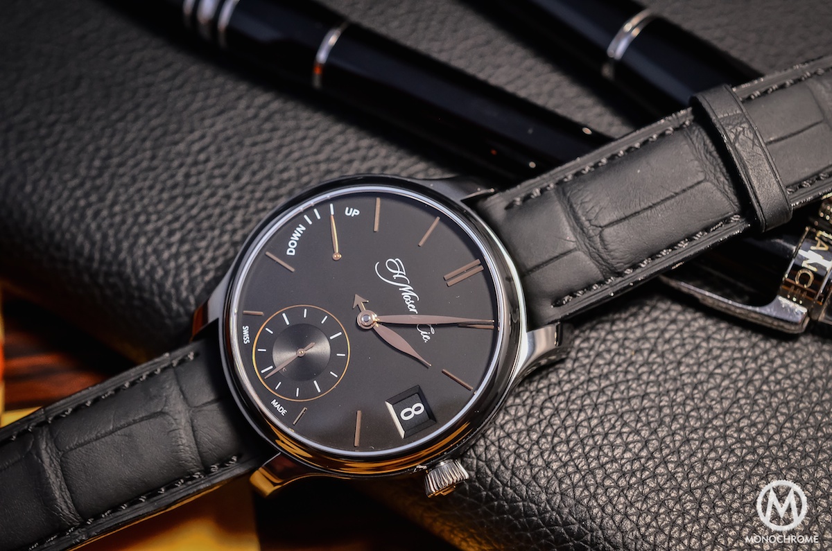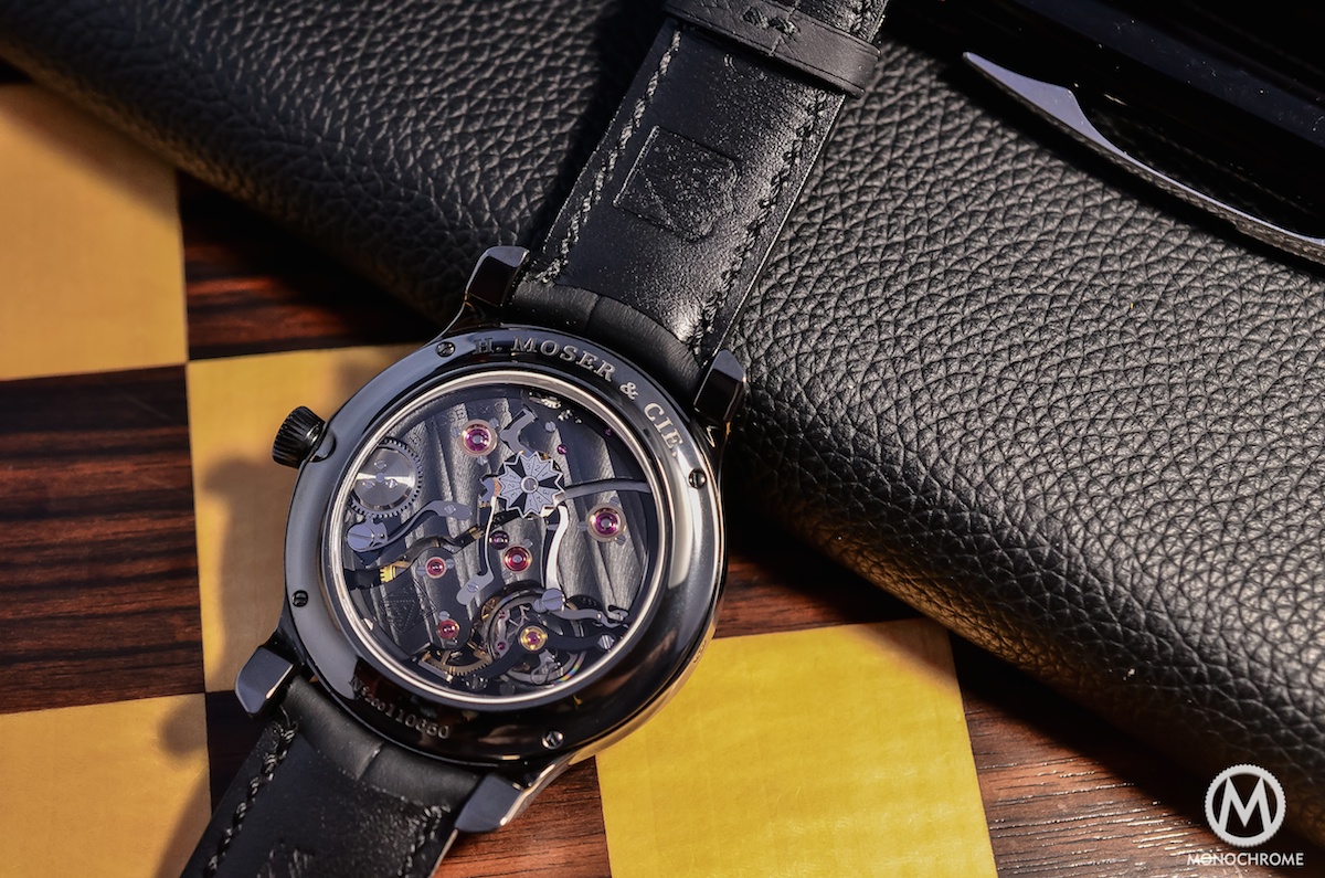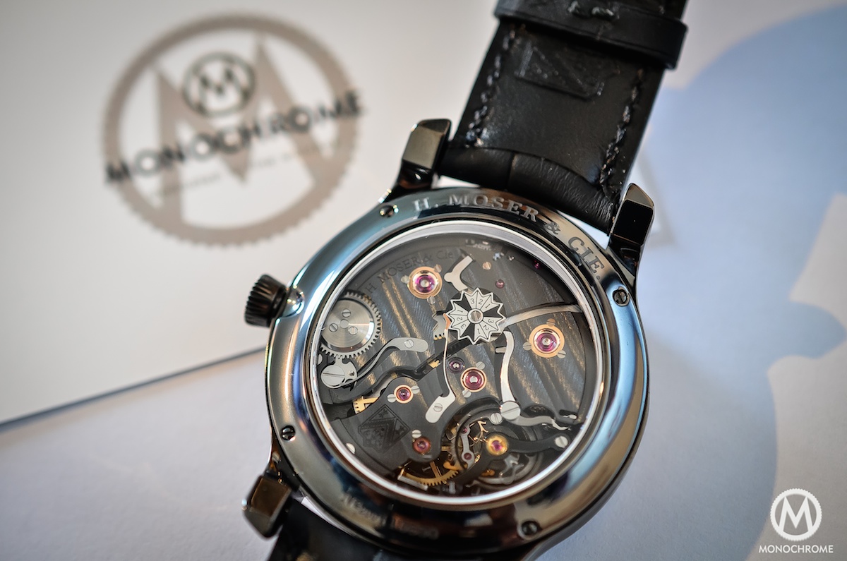 Some watches are made for business and red carpets – for example a Jaeger-LeCoultre Master Ultra-Thin. Some are made to match your leisures or free time – a massive dive watch like the IWC Aquatimer Chronograph or a colorful Hamilton Pan Europe. Of course, this H. Moser shouldn’t be considered as a proper sports watch, but it will be a natural fit both for a weekend trip or a formal meeting. You might think it is also the case for multiple watches. Right, but this ones adds the beauty of the mechanics in a pure, refined and discreet way. When some watches tends to look more complicated than they really are (a good example could be the Baume & Mercier Clifton Date Retrograde), this one is hiding its complications, creating a very egoistic pleasure that only the owner and the insiders will recognize.