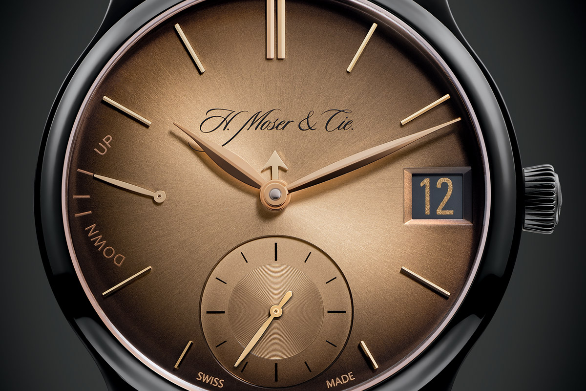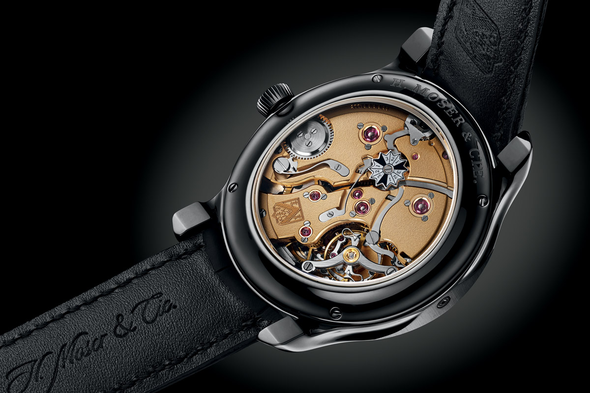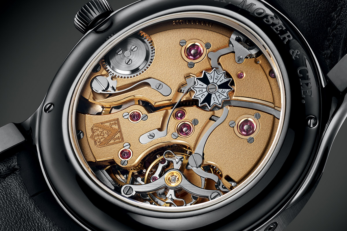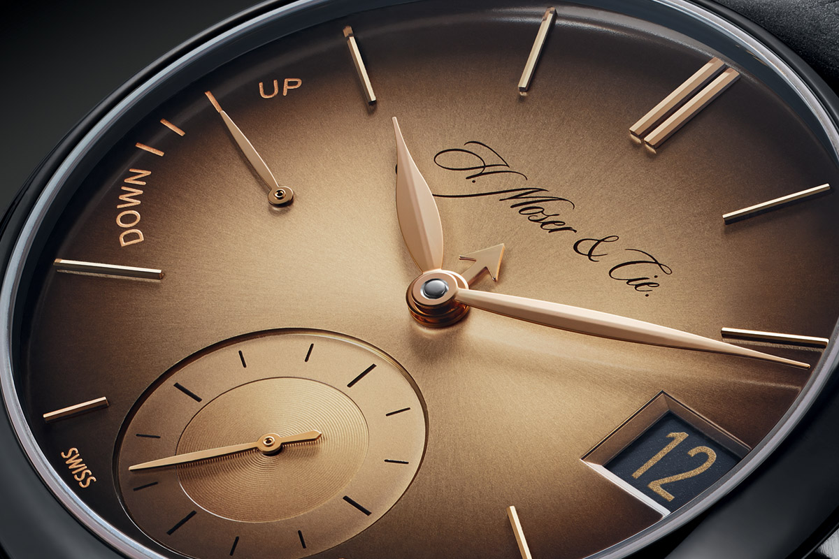 What’s new in this 10-piece limited edition is, firstly, the movement made of solid gold. All the bridges and plates are realized in gold and finished by hand: hand frost engraving (one of the hardest finishes to achieve) and polished bevelled angles. The rest of the movement is similar to the Black Edition, with oversized screwed gold chatons and a very pleasant layout. The dial is also made of solid gold, with H. Moser’s distinctive sunburst and fumé finish (which brings out a darker colour on the sides).