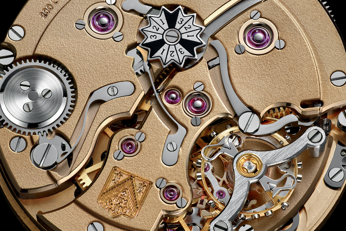 - Functions: Perpetual Flash Calendar. Centre-hand month indicator, 12 hour indexes = 12 months. Hour and minute. Off-centre seconds dial with hacking seconds function at 6 o’clock. Power reserve indicator at 9 o’clock. Leap year indicator and adjustment pusher. Double Pull Crown System