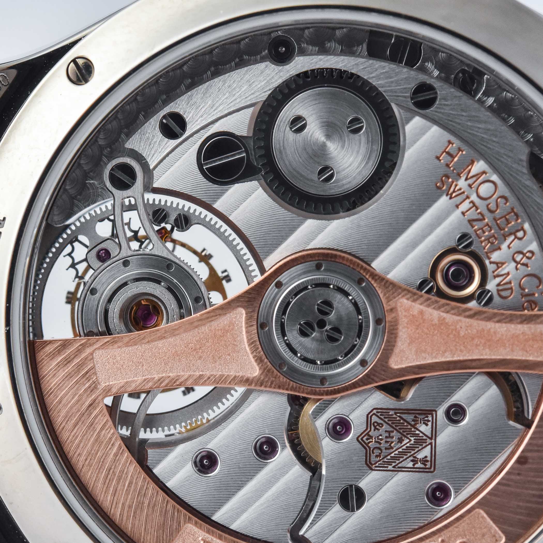 Like its predecessors, the H. Moser Endeavour Tourbillon Concept Tiger’s Eye is free of logos and markers on the dial, with only two leaf-shaped hands indicating hours and minutes. The only “break” in the dial is the one-minute tourbillon. The watches use the in-house designed, developed and manufactured HMC 804 automatic movement. This calibre is similar to the one in the blue and green fumé dial versions. The movement is decorated to the highest standards, including Moser-striping and skeletonised escapement bridges. It is fitted with a double-hairspring, made in-house by Moser, and has a 72-hour power reserve. Visible through the sapphire caseback, the rotor is18k red gold and features the brand’s logo.