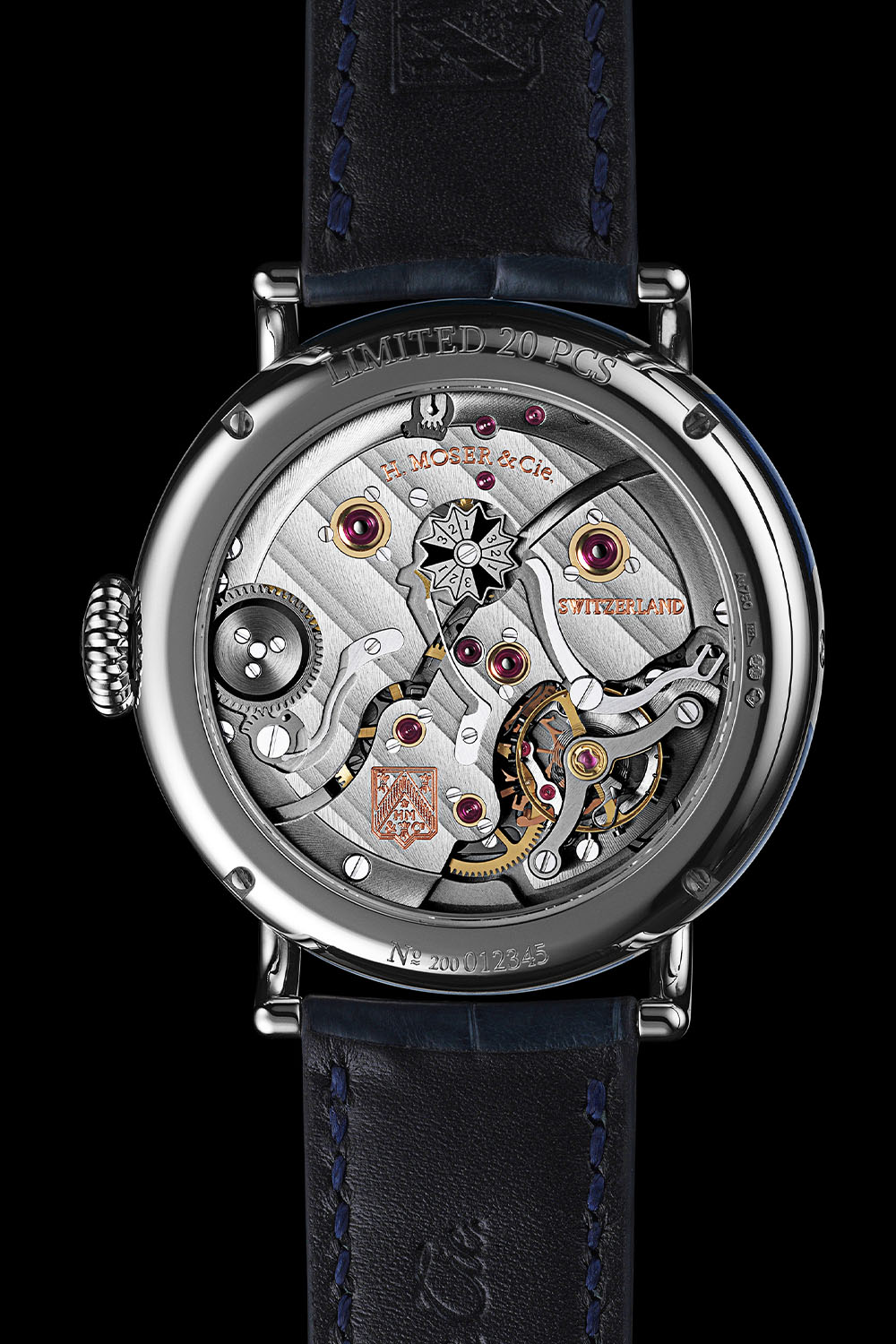 Visible behind the sapphire caseback is Moser’s well-known calibre HMC 800. Simple and ingenious, this hand-wound movement can be adjusted forwards or backwards at any time of day. Thanks to the “Flash Calendar” system, the date changes instantaneously at midnight, taking into account months with 30 or 31 days and the leap years. It is also powerful, with 7 days of autonomy and finely decorated with Moser double stripes, screwed gold chatons and polished bevels.