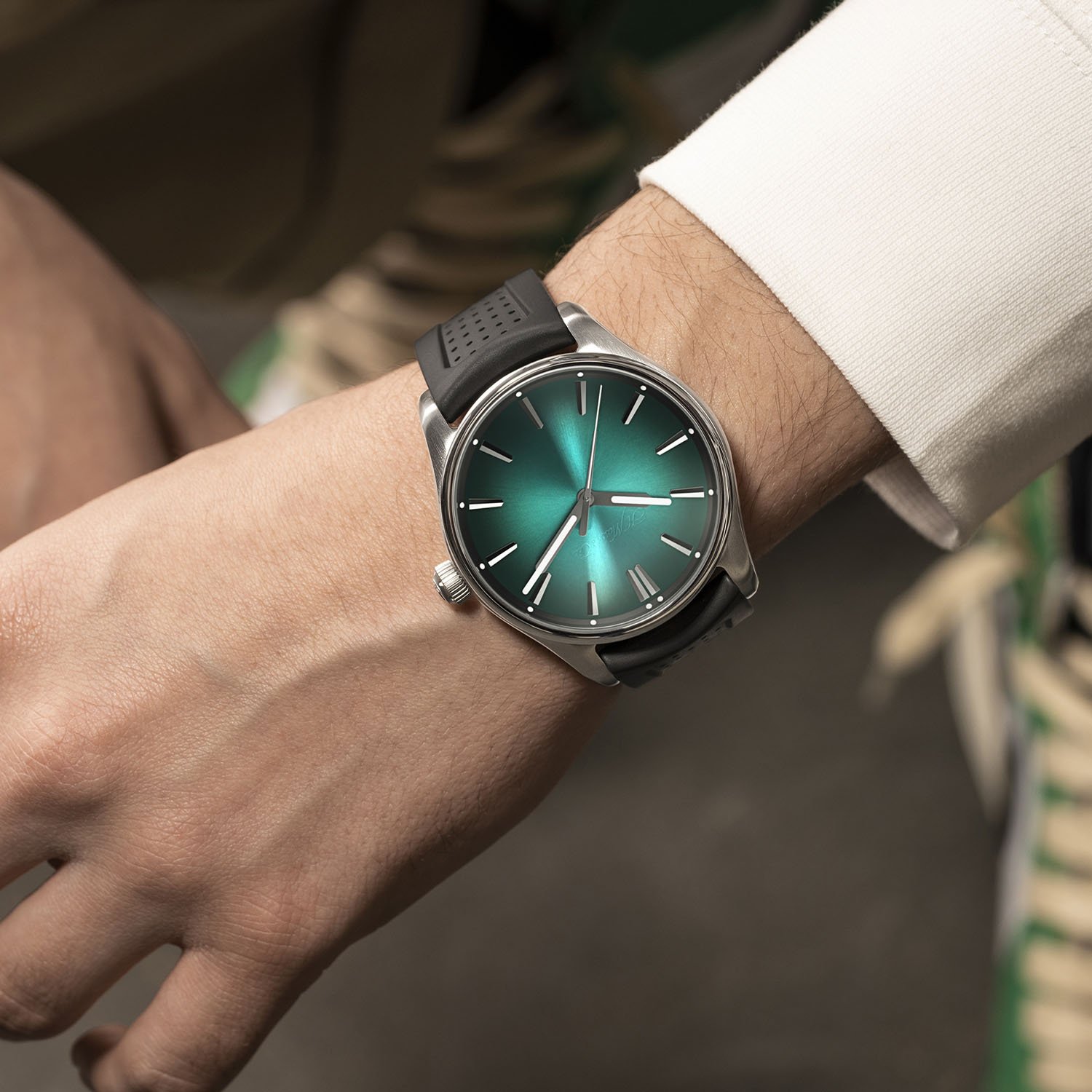 The H. Moser & Cie. Pioneer Centre Seconds MEGA Cool comes on a green kevlar strap, a rubber strap or alligator leather straps, as well as a steel bracelet. The watch will retail for CHF 13,900.