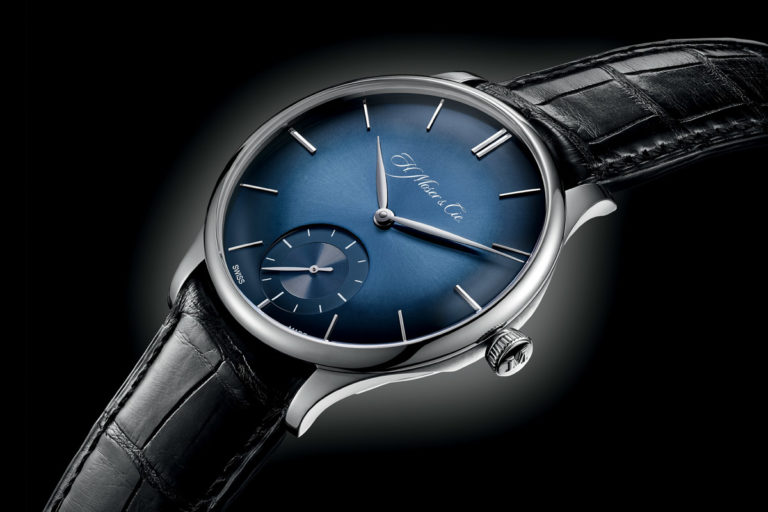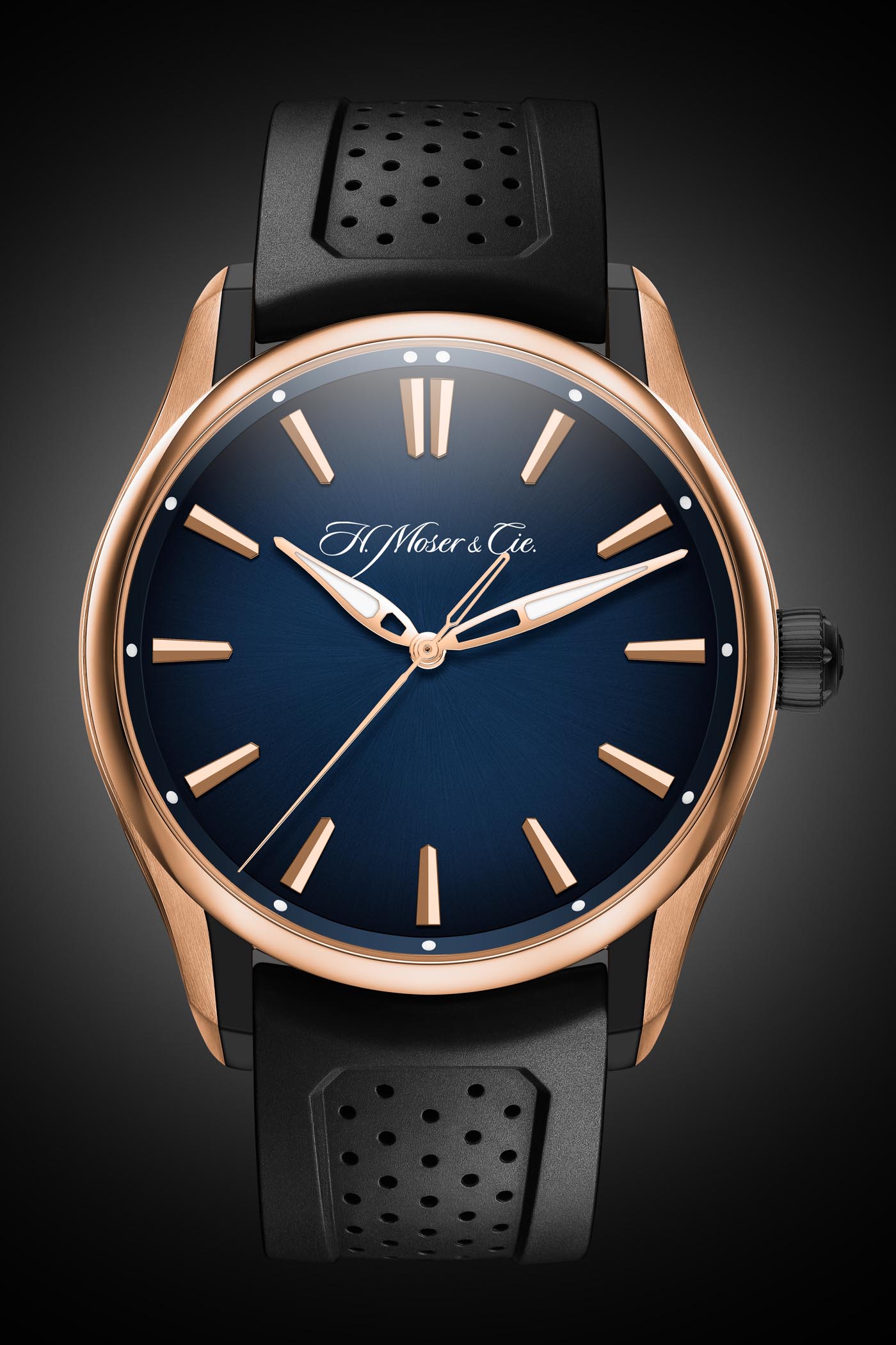 Second update: the dials. To contrast with the warm colour of the 5N gold, H. Moser relies on its most emblematic dial, the fumé blue. These dials are decorated first with a sunburst pattern and later painted with a gradient colour – midnight blue in the centre and almost black on the periphery. Indexes and hands match the gold case but are still filled with luminous paint.